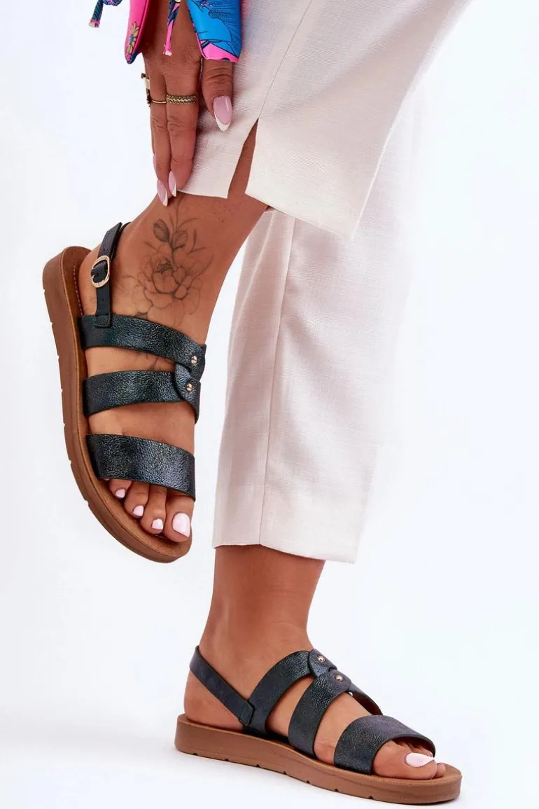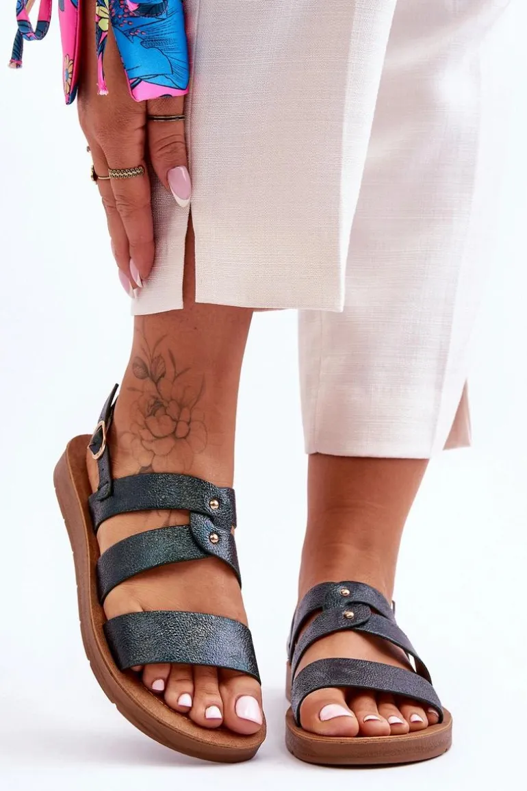 Wygodne, błyszczące sandały damskie zostały wykonane z eko skóry z dbałością o detale. Zapinane na regulowany pasek ze sprzączką. Delikatna platforma sprawia, że buty są niezwykle stabilne. Te sandałki to idealny fason na upalne dni. Przy wyborze rozmiaru prosimy kierować się tabelą rozmiarów.