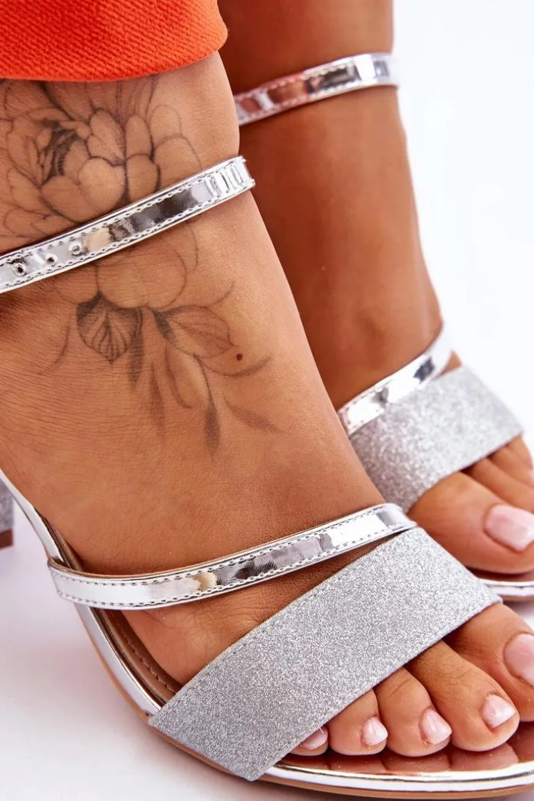 Piękne sandały na obcasie w postaci słupka. Buty te zostały wykonane z eko skóry. Dodatkowo paseczek z przodu oraz obcas są brokatowe, przez co buty wyglądają naprawdę elegancko. Miękka wkładka z eko skóry zapewni komfort podczas użytkowania. Buty posiadają regulowany pasek zapinany na sprzączkę wokół kostki. Model ten wykorzystasz podczas wielu uroczystości rodzinnych, imprez ze znajomymi czy biznesowych spotkań. Przy wyborze rozmiaru prosimy sugerować się tabelą rozmiarów.