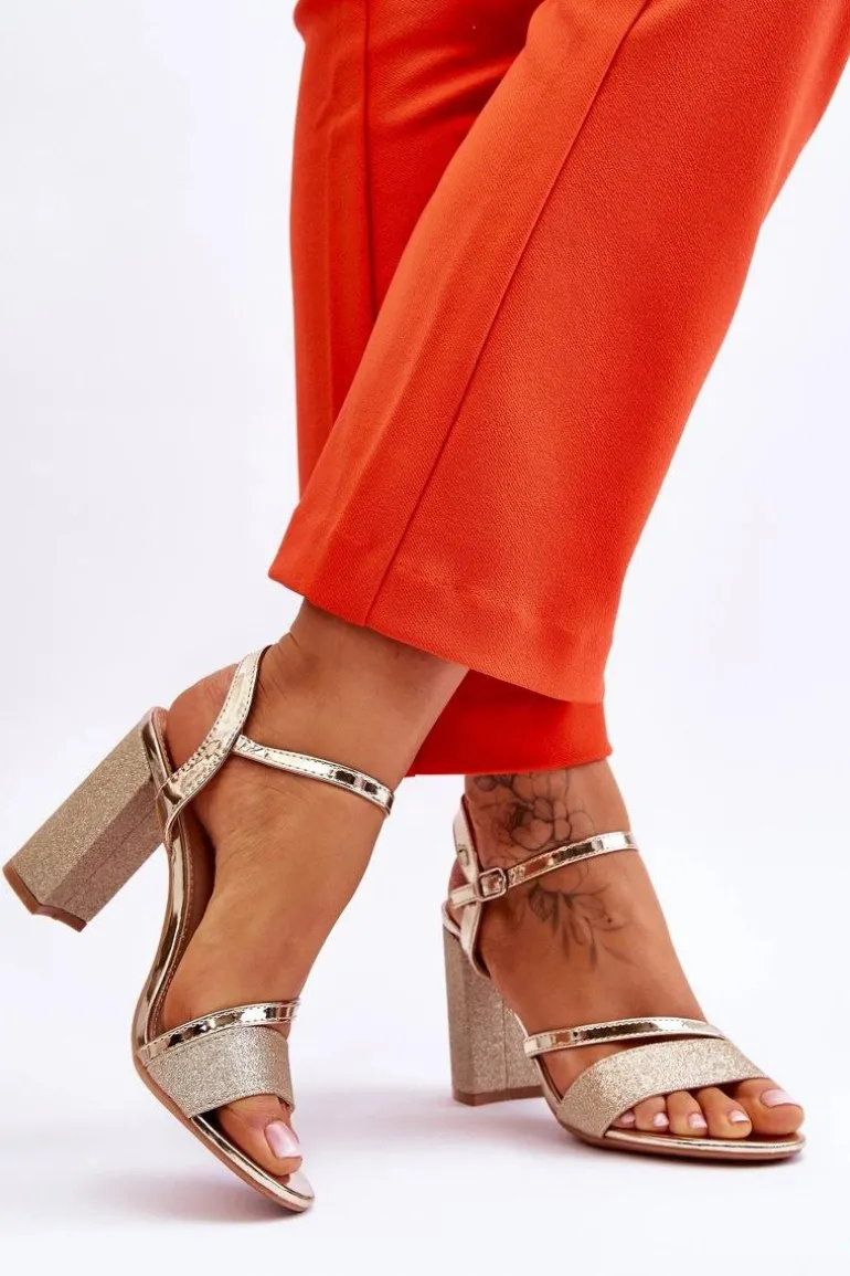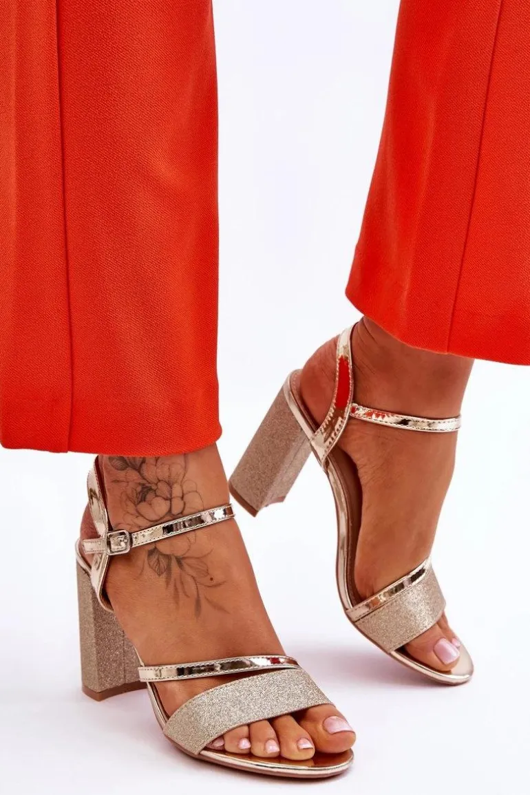 Piękne sandały na obcasie w postaci słupka. Buty te zostały wykonane z eko skóry. Dodatkowo paseczek z przodu oraz obcas są brokatowe, przez co buty wyglądają naprawdę elegancko. Miękka wkładka z eko skóry zapewni komfort podczas użytkowania. Buty posiadają regulowany pasek zapinany na sprzączkę wokół kostki. Model ten wykorzystasz podczas wielu uroczystości rodzinnych, imprez ze znajomymi czy biznesowych spotkań. Przy wyborze rozmiaru prosimy sugerować się tabelą rozmiarów.
