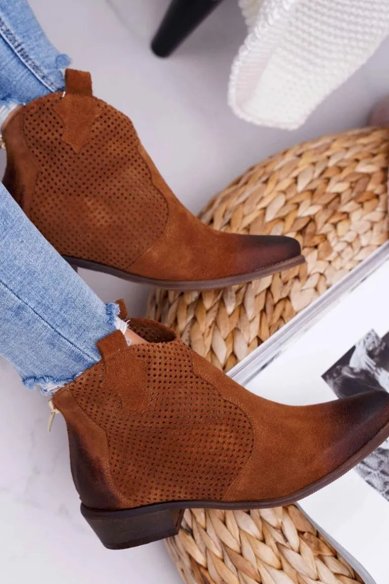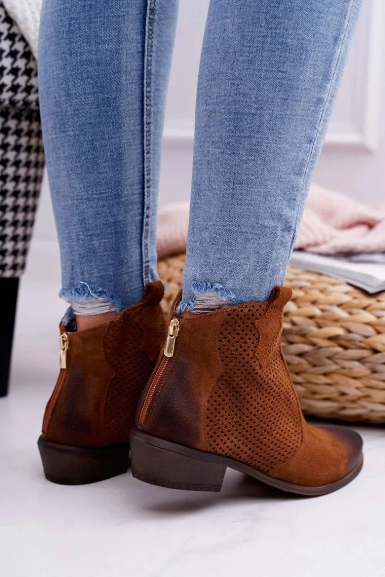 Botki to nie tylko buty na chłodne dni. Świetnie sprawdzą się również podczas tworzenia wiosennych stylizacji. Ażurowy design oraz zapinanie na zamek z tyłu cholewki. Botki w całości wykonane z naturalnej skóry. Produkt Polski firmy Exquisite co gwarantuje nam komfort oraz wysoką jakość wykonania. Idealne do zwiewnych sukienek oraz jeansowych spodni. Przy wyborze rozmiaru prosimy sugerować się tabelą rozmiarów.