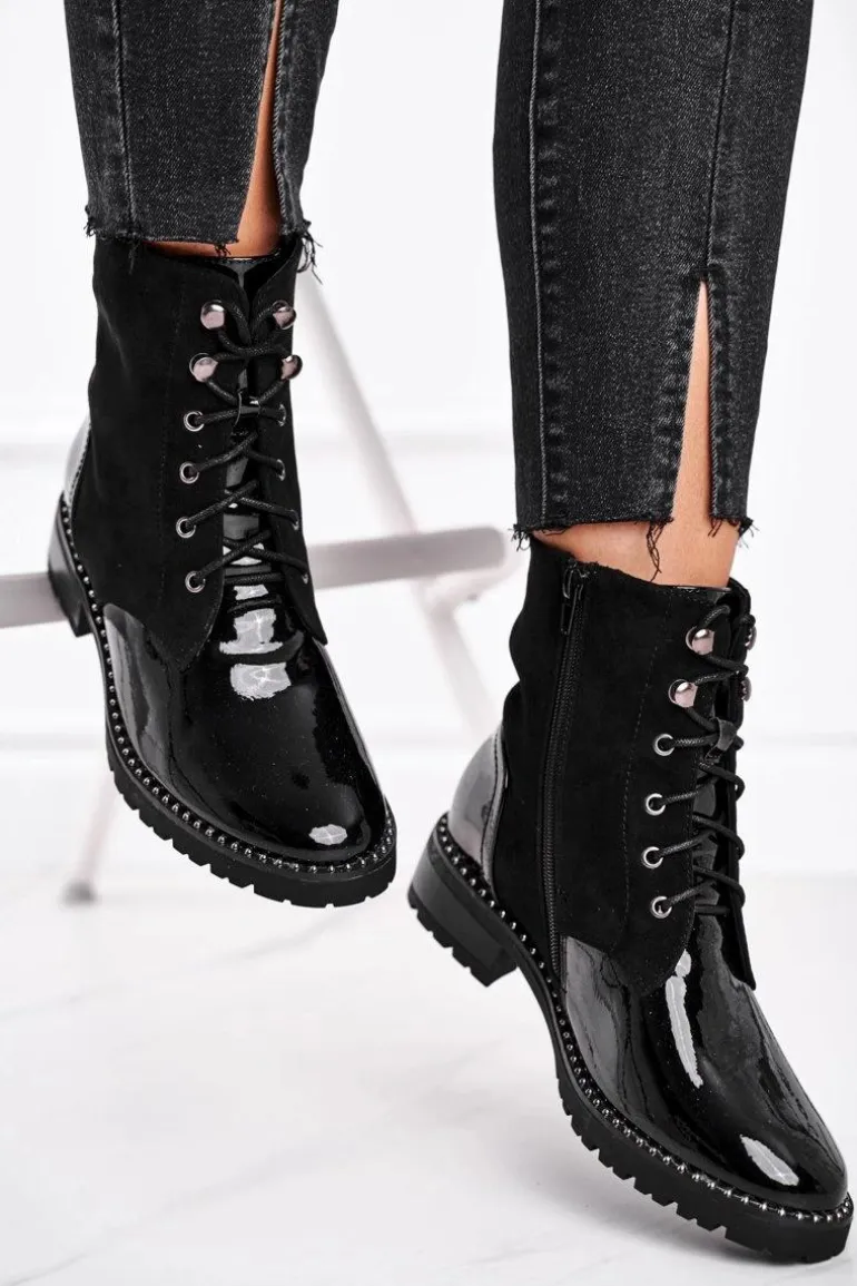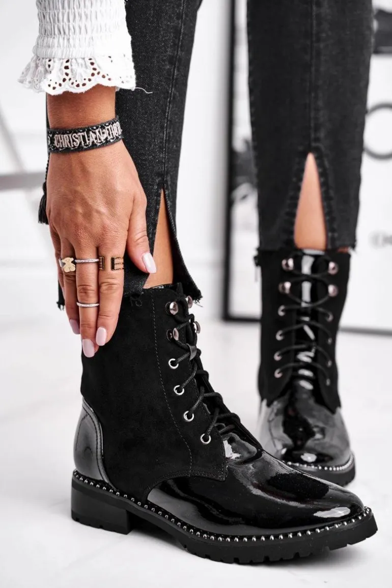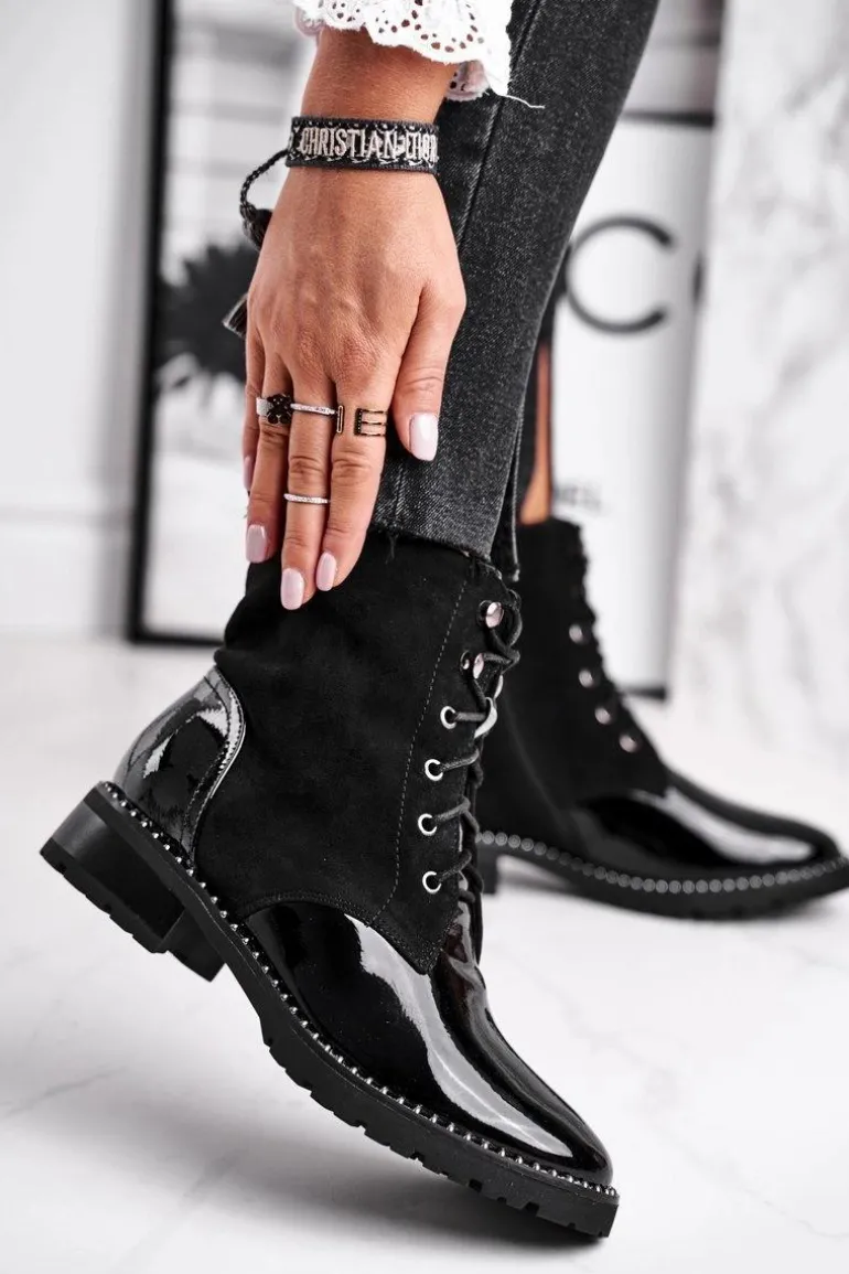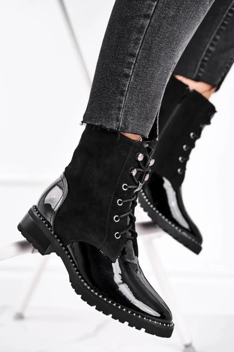 Czy może nas coś jeszcze zaskoczyć? Oczywiście! Spójrz na te przepiękne botki. Wierzch to połączenie lakierowanej skóry ekologicznej oraz eko zamszu. Wnętrze pokryte ciepłym i miłym w dotyku kocem obuwniczym, więc nie będziesz wiedzieć co to mroźne dni! Fason klasycznie sznurowany z dodatkowym zapinaniem na suwak z boku cholewki. Nie zwlekaj, bo te cudeńka rozchodzą się bardzo szybko! Przy wyborze rozmiaru prosimy sugerować się tabelą rozmiarów.