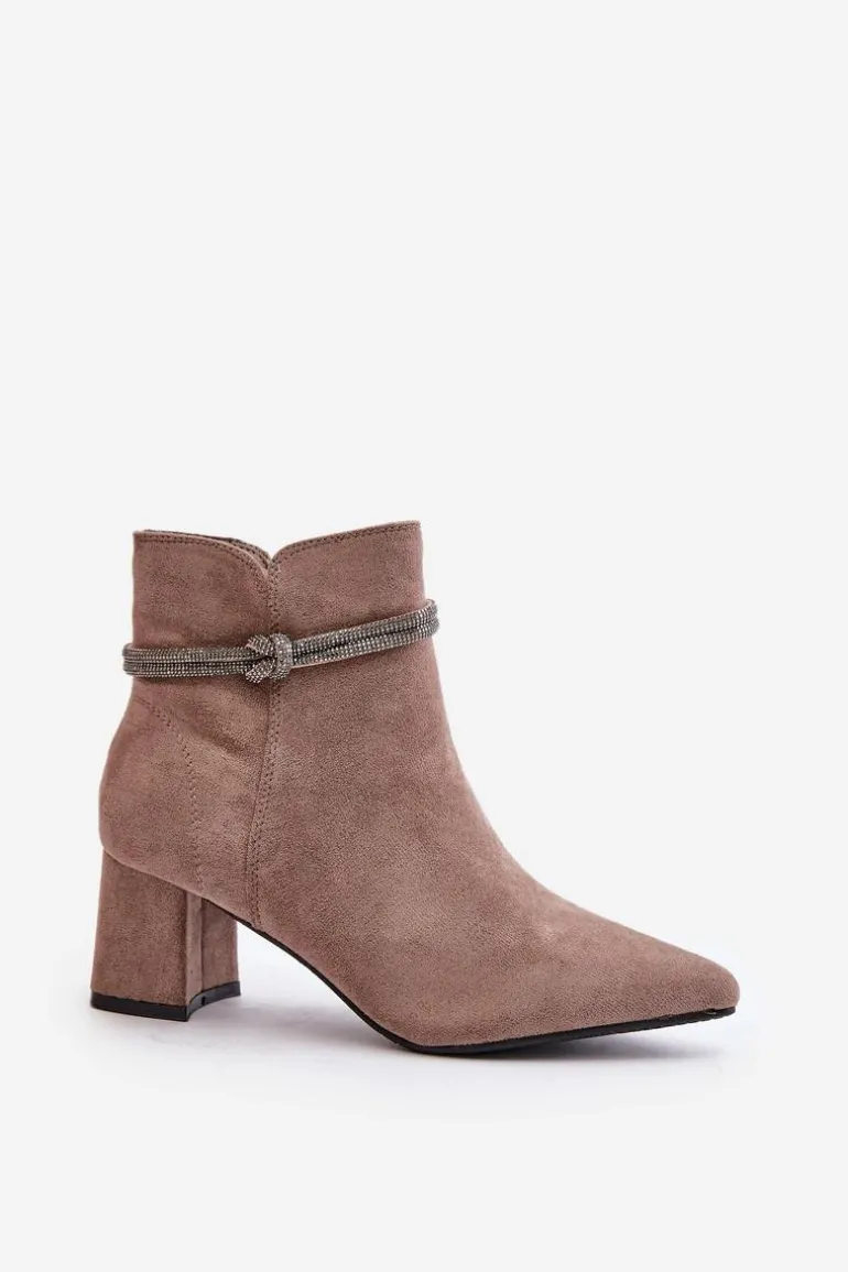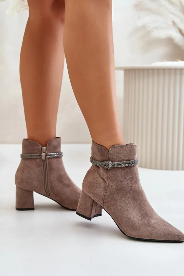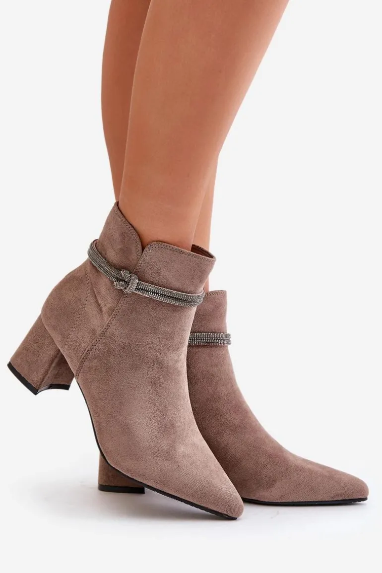 Botki damskie z cholewką sięgającą za kostkę. Wykonane z miłego w dotyku eko zamszu. Osadzone na obcasie w formie słupka. Cholewka ozdobiona błyszczącym paseczkiem. Noski w szpic optycznie wysmuklą nogi. Zapięcie na zamek gwarantuje łatwe zakładanie i zdejmowanie butów, co jest szczególnie praktyczne w codziennym użytkowaniu. Przy wyborze rozmiaru prosimy sugerować się tabelą rozmiarów.