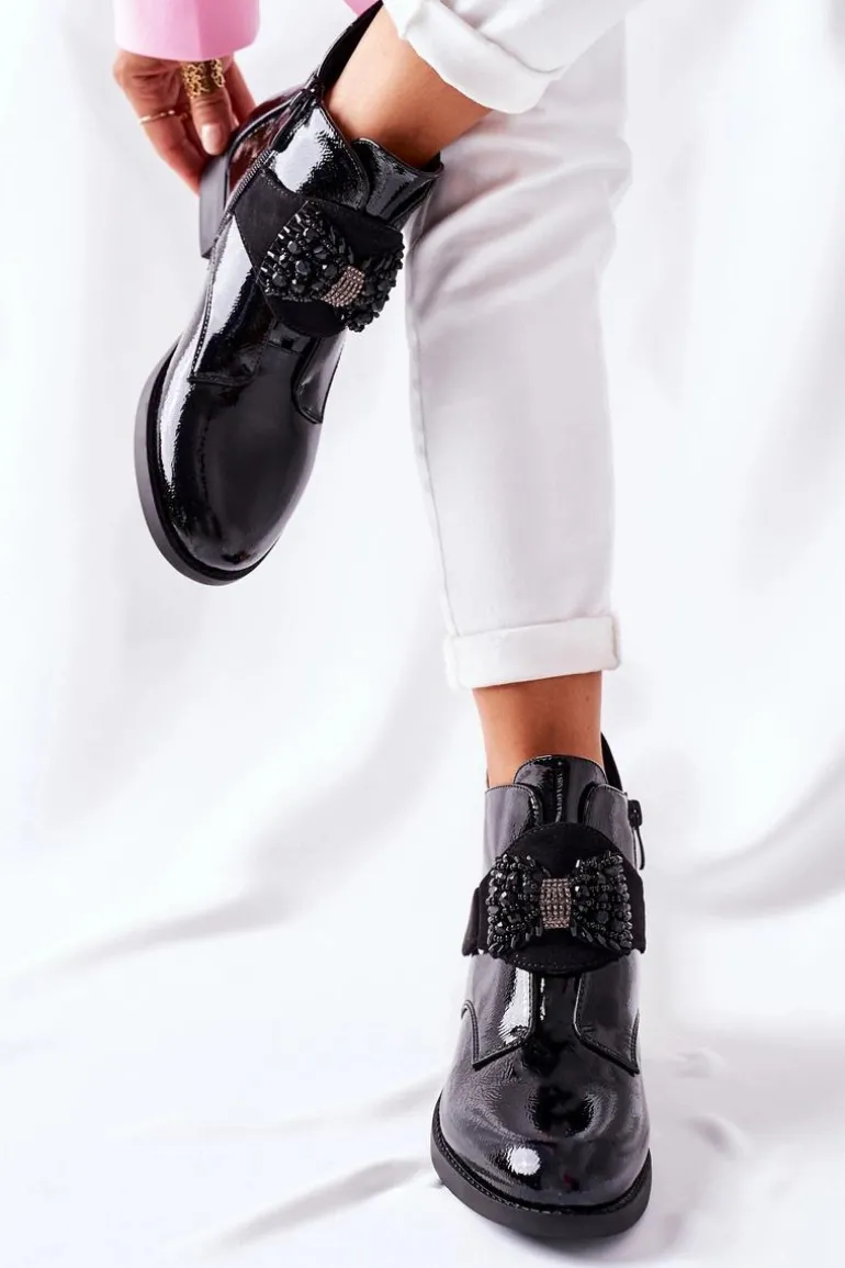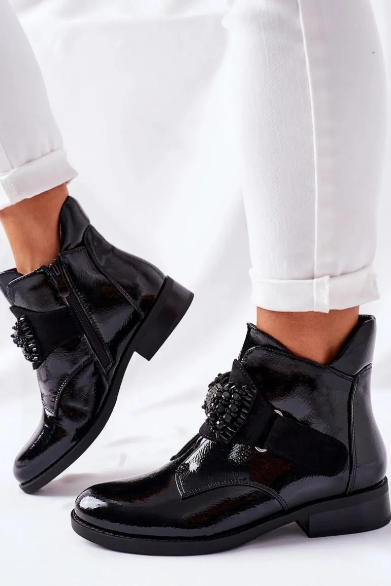 Te cudowne botki mogą być Twoje! Wykonane z lakierowanej skóry ekologicznej. Wnętrze jak i wkładka wyścielone kocem obuwniczym. Przy wyborze rozmiaru prosimy sugerować się tabelą rozmiarów.