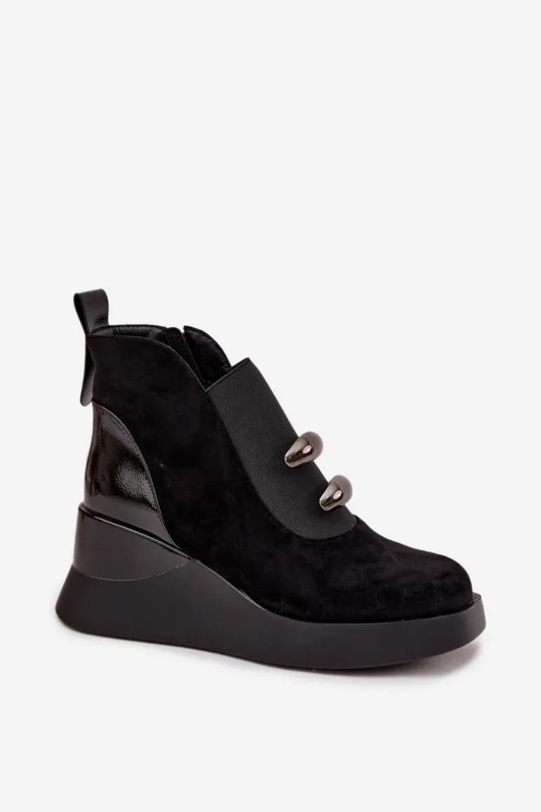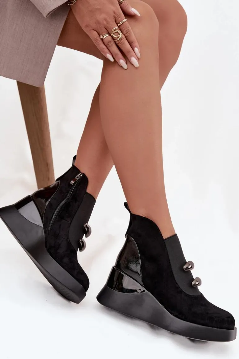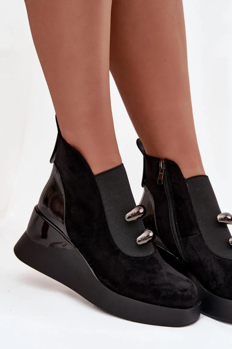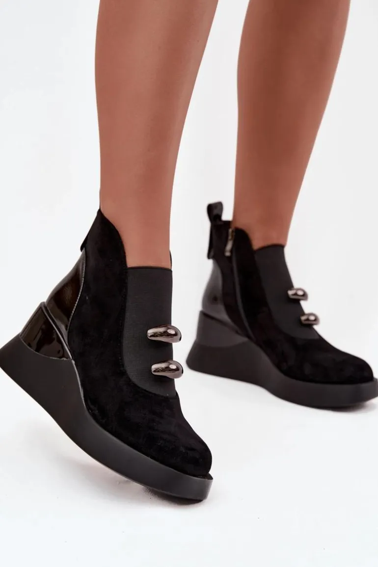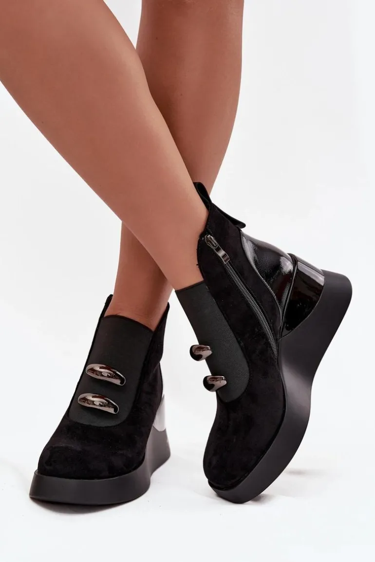 Botki damskie wykonane z eko zamszu. Model osadzony na koturnie subtelnie unosi sylwetkę, zapewniając stabilność i komfort podczas noszenia. Z przodu umieszczono elastyczną wstawkę oraz dwa ozdobne elementy, które dodają wyjątkowego charakteru. Zamek z boku ułatwia zakładanie, a delikatne ocieplenie sprawia, że botki doskonale sprawdzą się w chłodniejsze dni. To uniwersalny model, który świetnie komponuje się zarówno z codziennymi, jak i bardziej eleganckimi stylizacjami, podkreślając ich kobiecy i nowoczesny styl. Przy wyborze rozmiaru prosimy sugerować się tabelą rozmiarów.