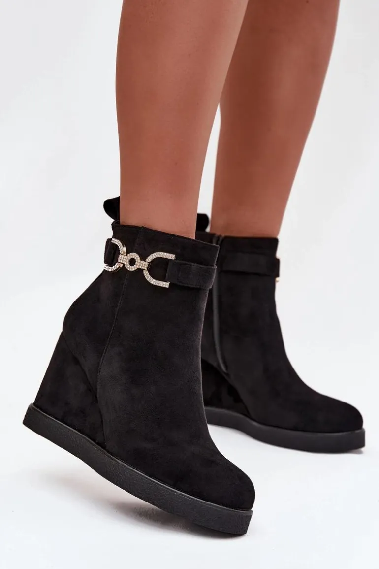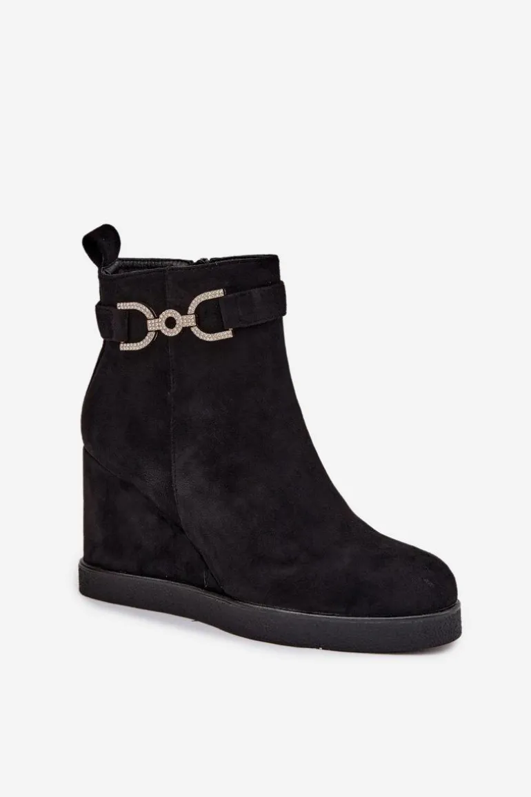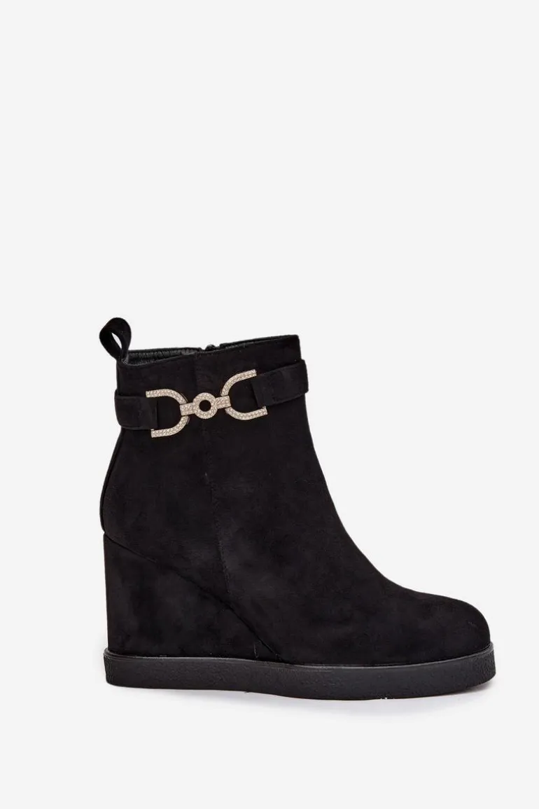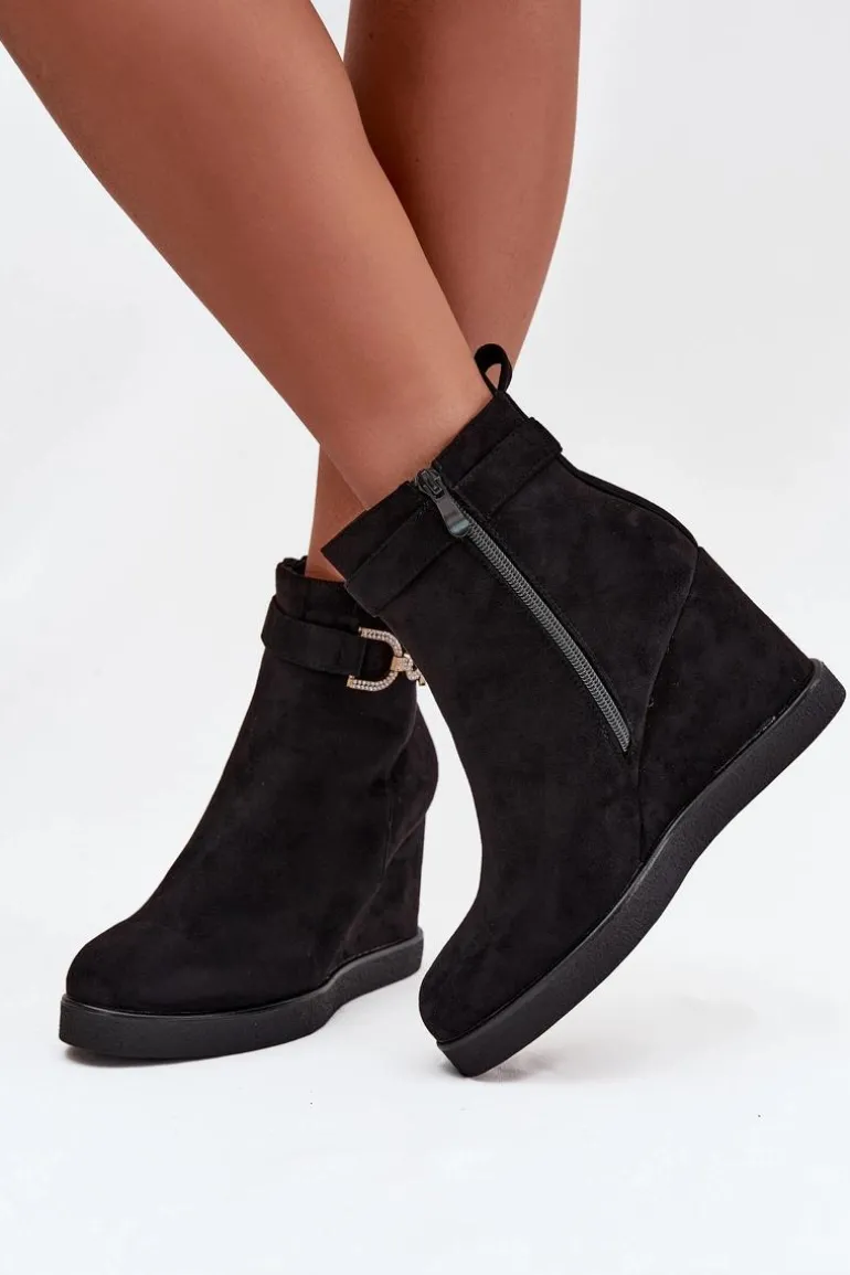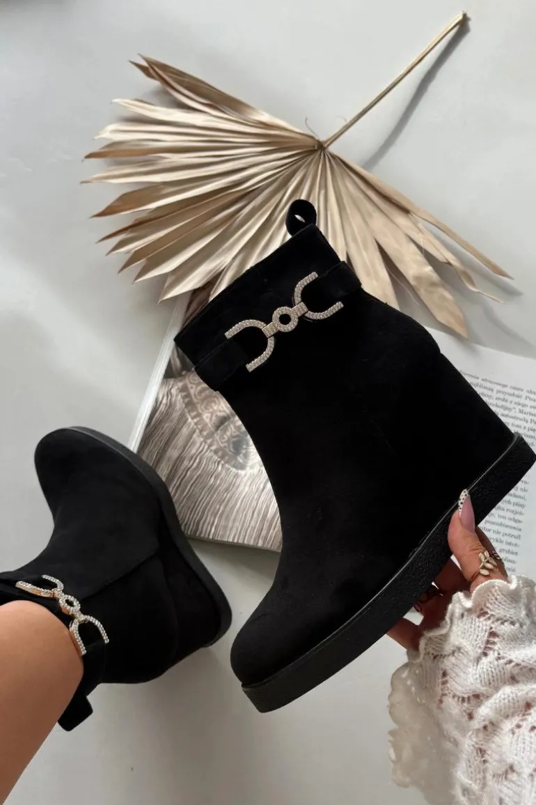 Botki damskie z eko zamszu to stylowa propozycja dla kobiet ceniących wygodę i modny wygląd. Osadzone na koturnie zapewniają komfort noszenia i subtelnie podkreślają sylwetkę, a zaokrąglone noski nadają im klasycznego charakteru. Model wyróżnia się paskiem z ozdobnym detalem umieszczonym na górze cholewki, który dodaje całości eleganckiego akcentu. Zamek po boku ułatwia zakładanie i zdejmowanie, czyniąc buty praktycznym wyborem na co dzień. Przy wyborze rozmiaru prosimy sugerować się tabelą rozmiarów.