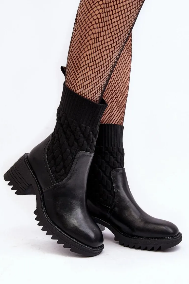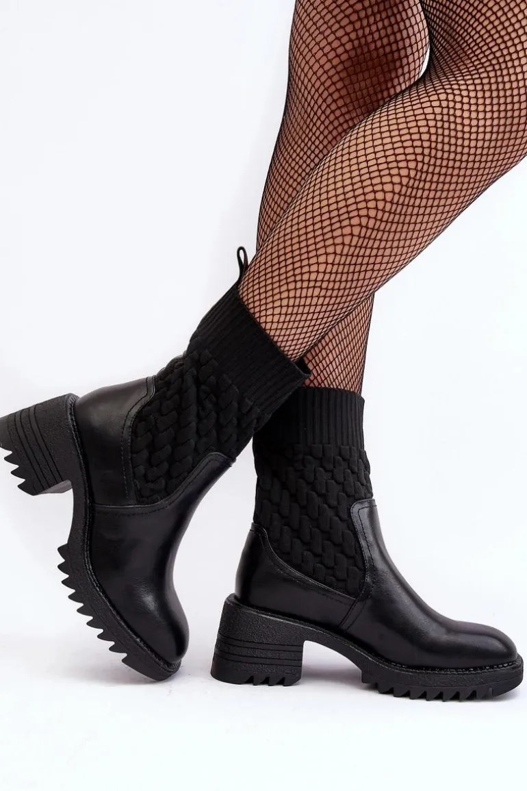 Botki damskie wykonane z połączenia eko skóry i tkaniny. Niski, masywny obcas oraz platforma zapewnią stabilność na każdym kroku. Noski w kwadrat. Usztywniony zapiętek. Środek ocieplony kocem obuwniczym wyłącznie na wysokości stopy. Przy wyborze rozmiaru prosimy sugerować się tabelą rozmiarów.