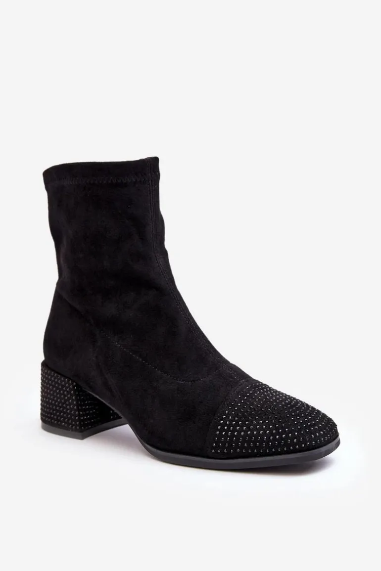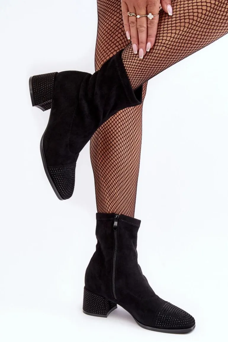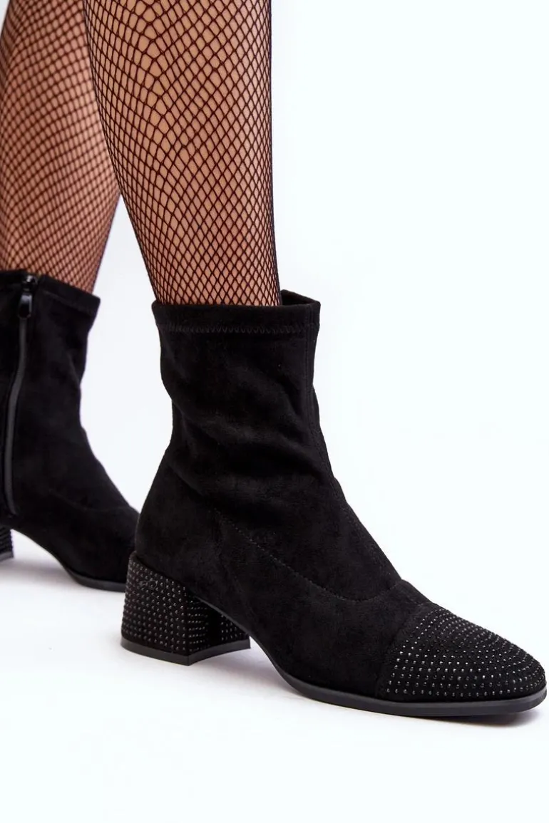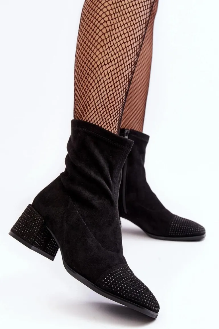 Botki damskie z cholewką za kostkę. Wykonane z eko zamszu. Osadzone na niskim, ozdobionym dżetami obcasie. Zapinane na zamek. Noski zaokrąglone. Środek ocieplony kocem obuwniczym wyłącznie na wysokości stopy. Klasyczny model, idealny do wielu jesiennych stylizacji! Przy wyborze rozmiaru prosimy sugerować się tabelą rozmiarów.