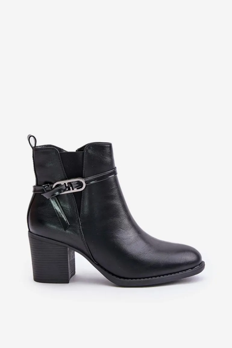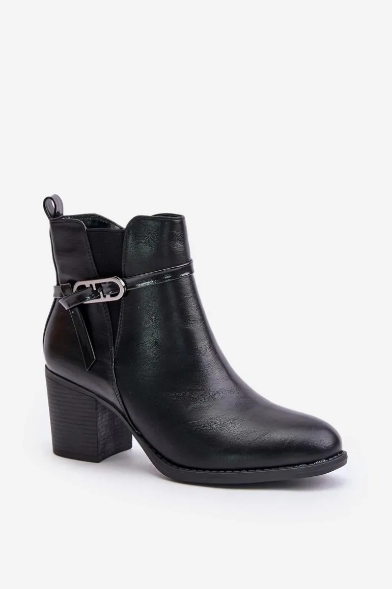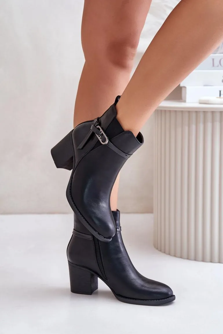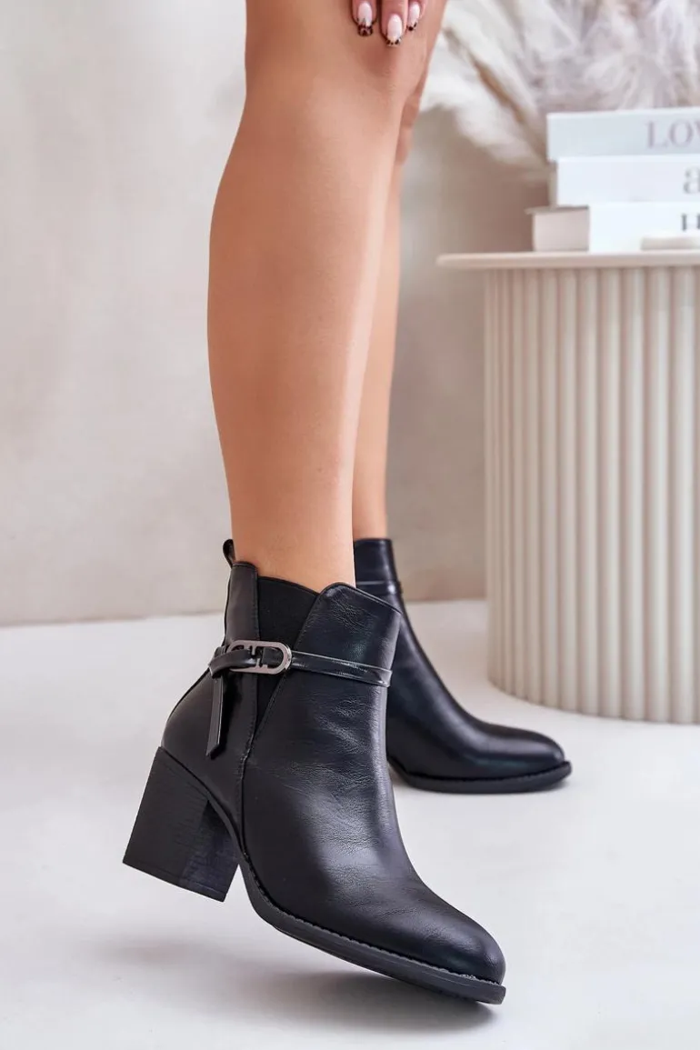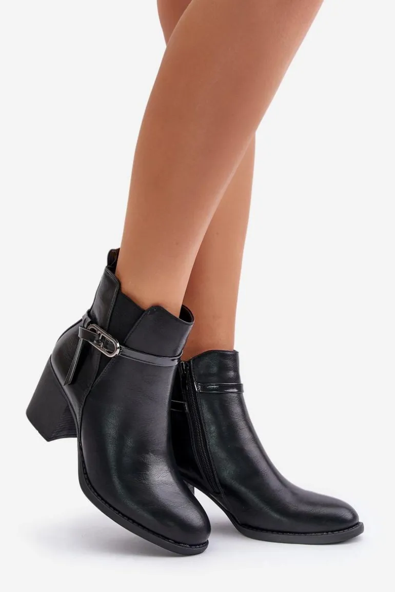 Damskie botki od marki Jezzi. Wykonane z eko skóry. Osadzone na obcasie w formie słupka. Noski zaokrąglone. Środek ocieplany kocem obuwniczym. Na cholewce pasek, który nadaje elegancji. Zapinane na zamek. Modne i wygodne, te botki to must-have w Twojej garderobie! Przy wyborze rozmiaru prosimy sugerować się tabelą rozmiarów.