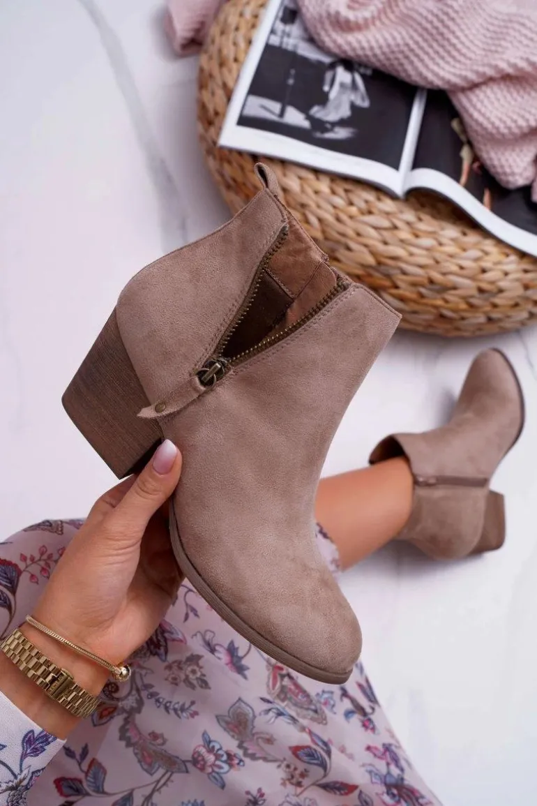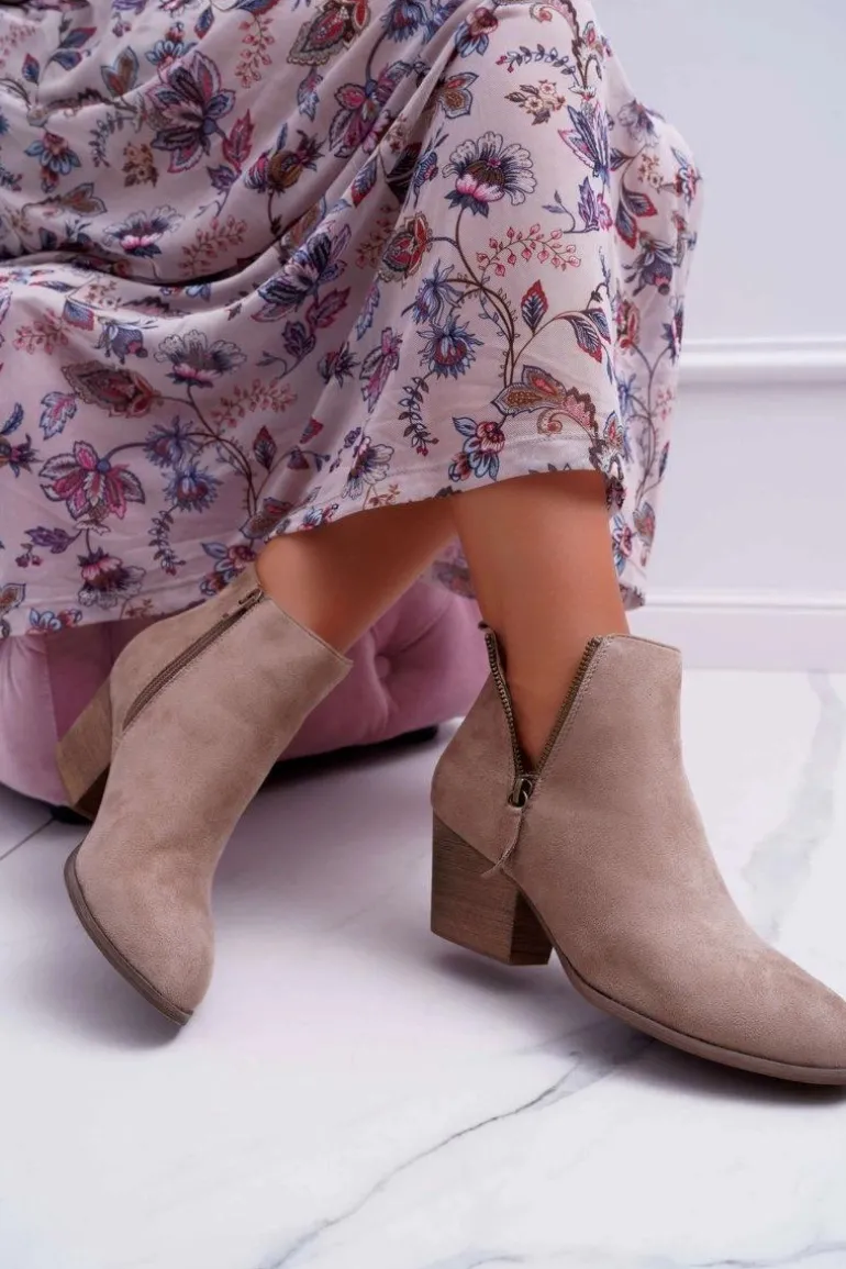 Botki Damskie Na Obcasie Suwak Zamszowe Beżowe Farre