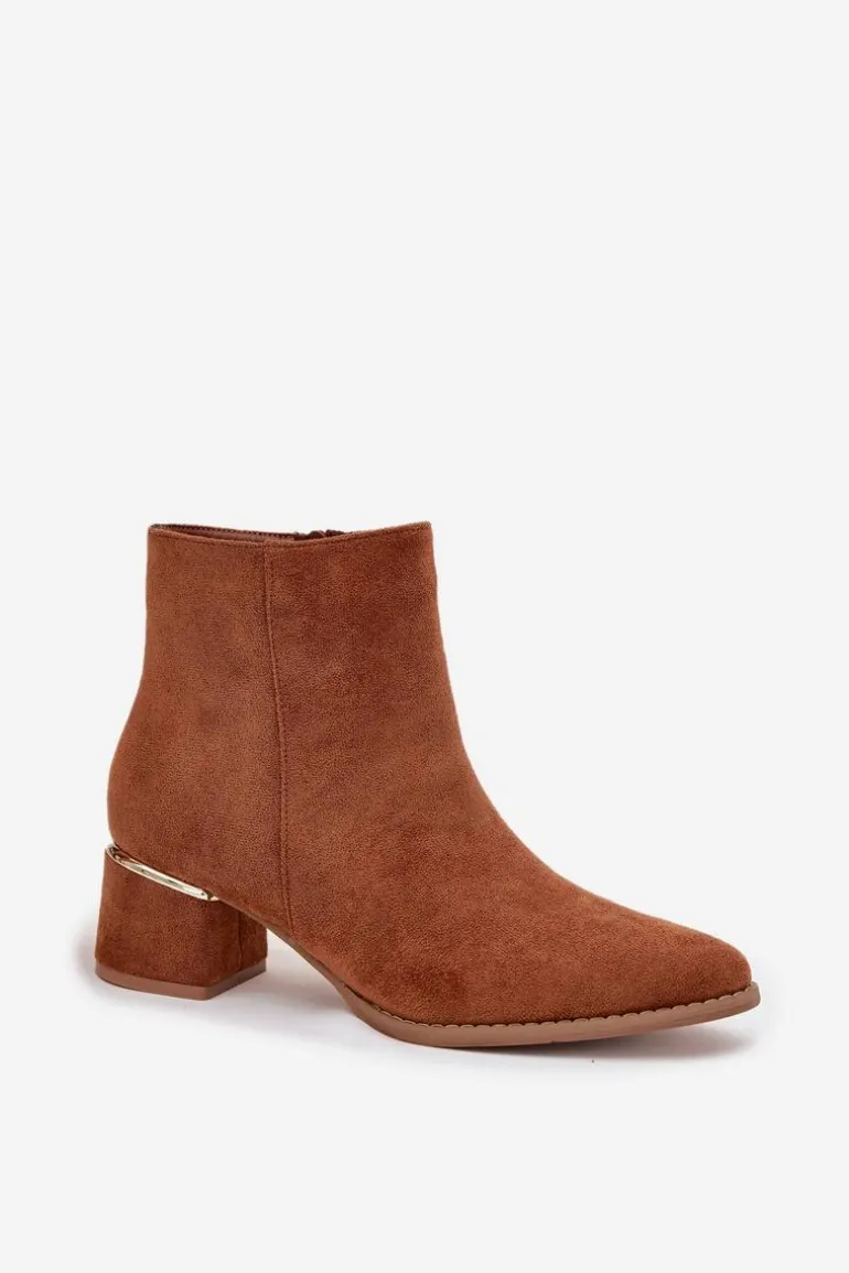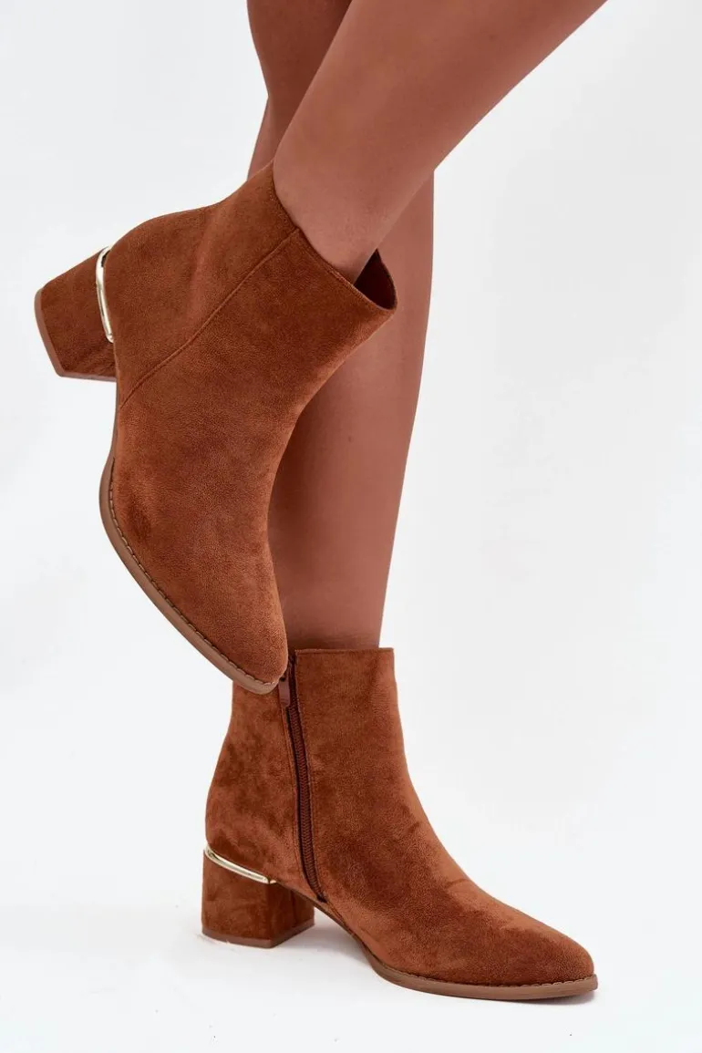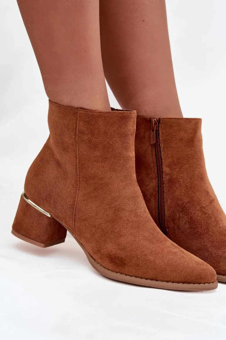 Botki damskie z eko zamszu to świetna propozycja na chłodniejsze dni. Zapinane na zamek, są wygodne w zakładaniu i zdejmowaniu. Stylowego charakteru nadaje im złoty element przy obcasie. Wnętrze ocieplane kocem obuwniczym, co zapewnia komfort i ciepło w jesienne i zimowe dni. To model idealny do codziennych i eleganckich stylizacji. Przy wyborze rozmiaru prosimy sugerować się tabelą rozmiarów.