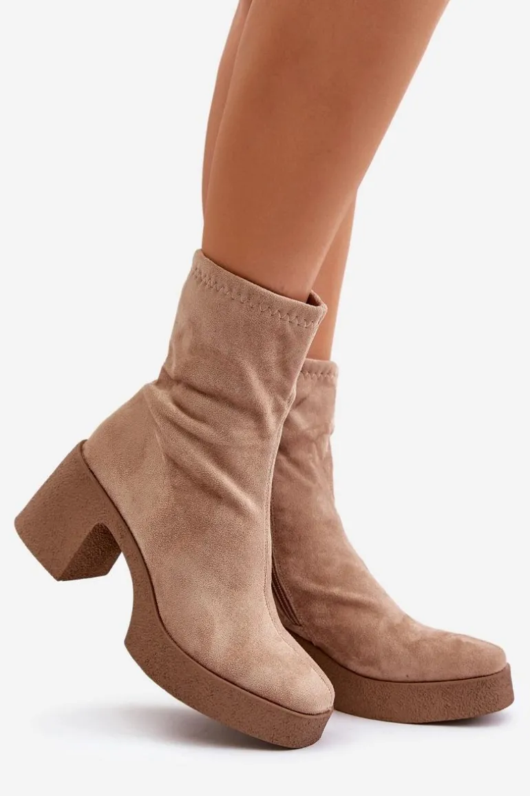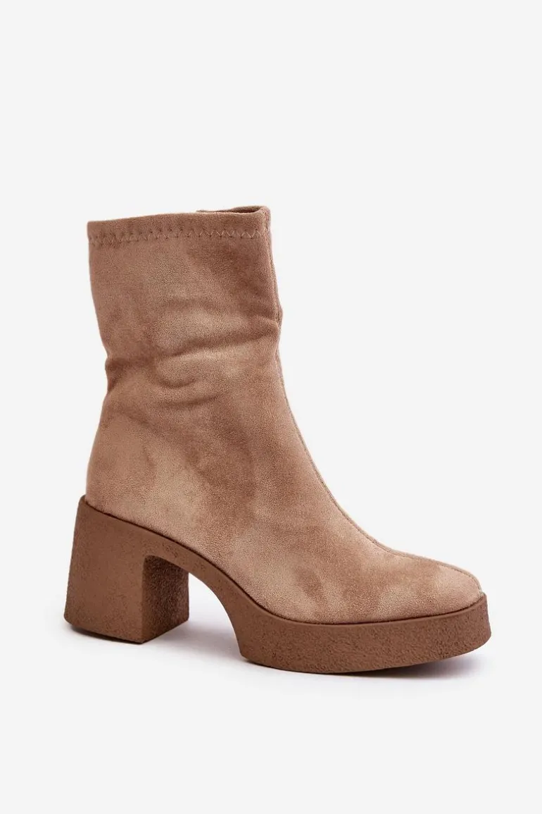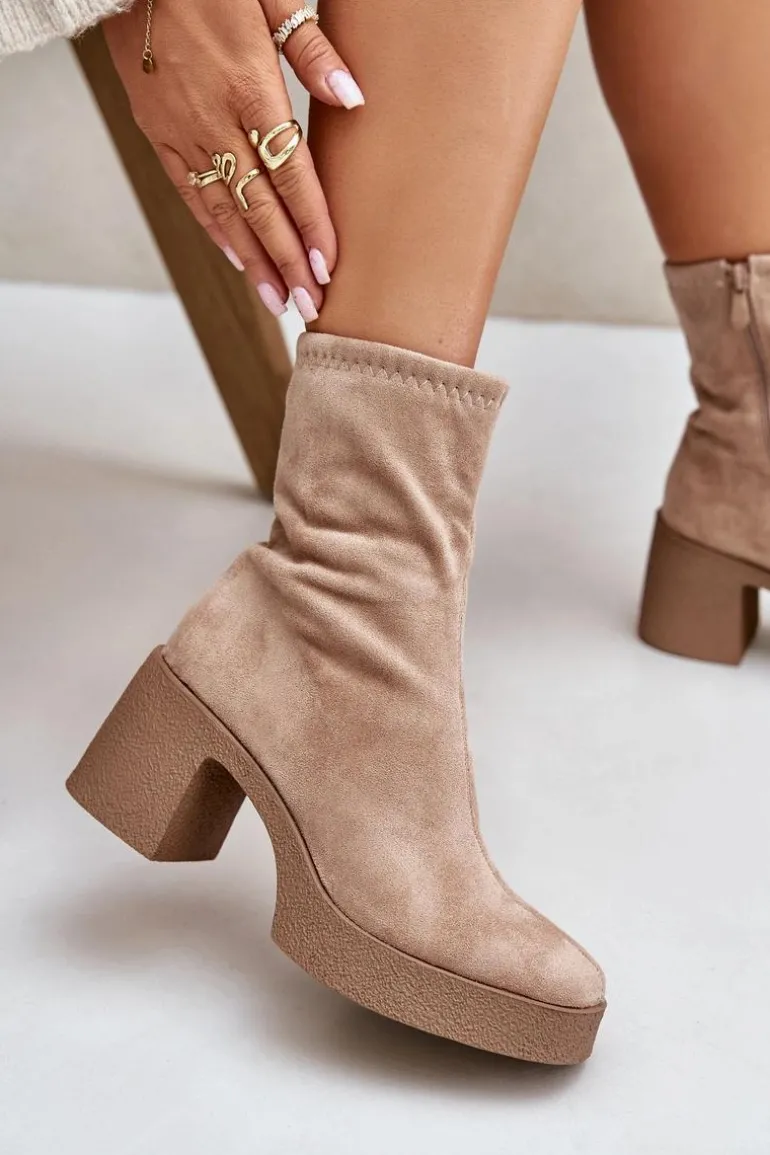 Botki damskie wykonane z eko skóry. Osadzone na masywnym obcasie słupku i platformie. Noski zaokrąglone. Zapinane na zamek. Miękka wkładka zapewni komfortowe użytkowanie. Idealne do stylizacji z sukienkami i spódnicami. Przy wyborze rozmiaru prosimy sugerować się tabelą rozmiarów.