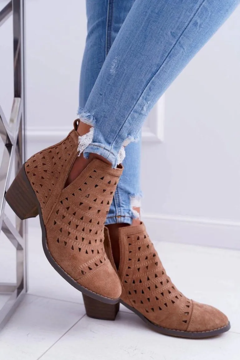 Botki Damskie Na Słupku Ażurowe z Wycięciami Brązowe Mediolan