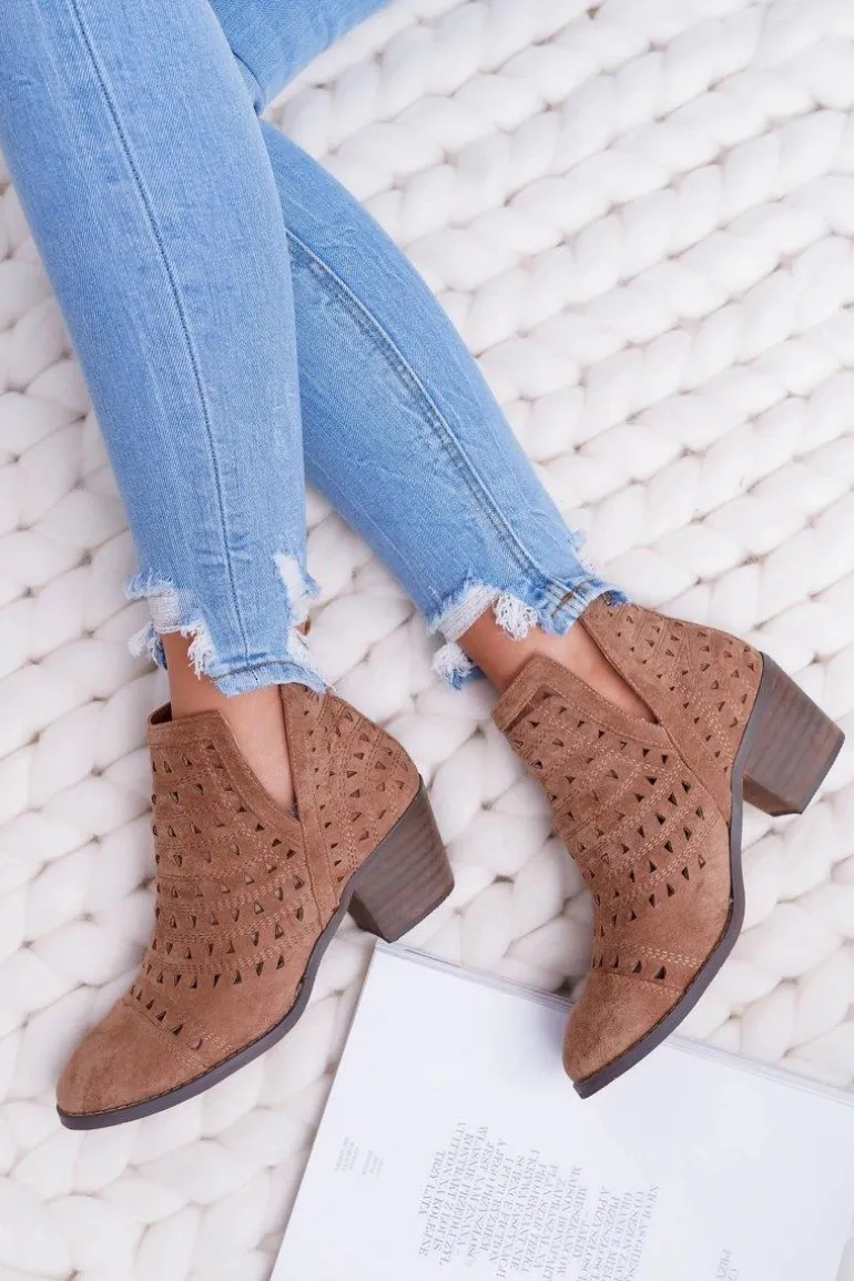 Najmodniejsze botki w tym sezonie! Wyjątkowy styl i staranne wykonanie sprawiają że są jednym z najbardziej rozchwytywanych modeli tego sezonu! Wierzch wykonany z wysokogatunkowego ekozamszu. Zastosowanie delikatnej wkładki oraz stabilnego, niskiego słupka sprawi, że poczujesz się w nich bardzo pewnie! Po prostu musisz je mieć w swojej szafie. Modny ażurowy wzór będzie wspaniałym uzupełnieniem naszej garderoby. Podczas wyboru rozmiaru prosimy kierować się tabelą rozmiarów.