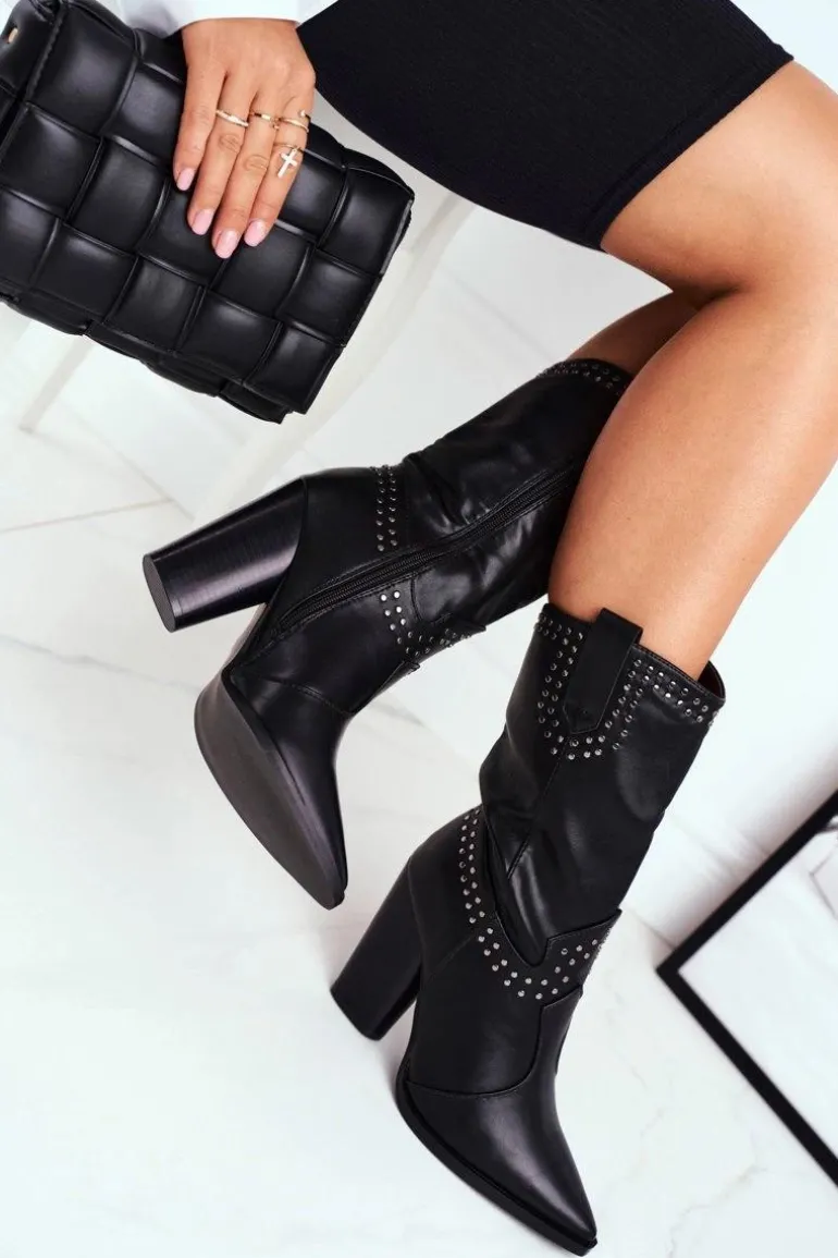Botki Damskie Na Słupku Ciepłe Kowbojki Czarne Athens