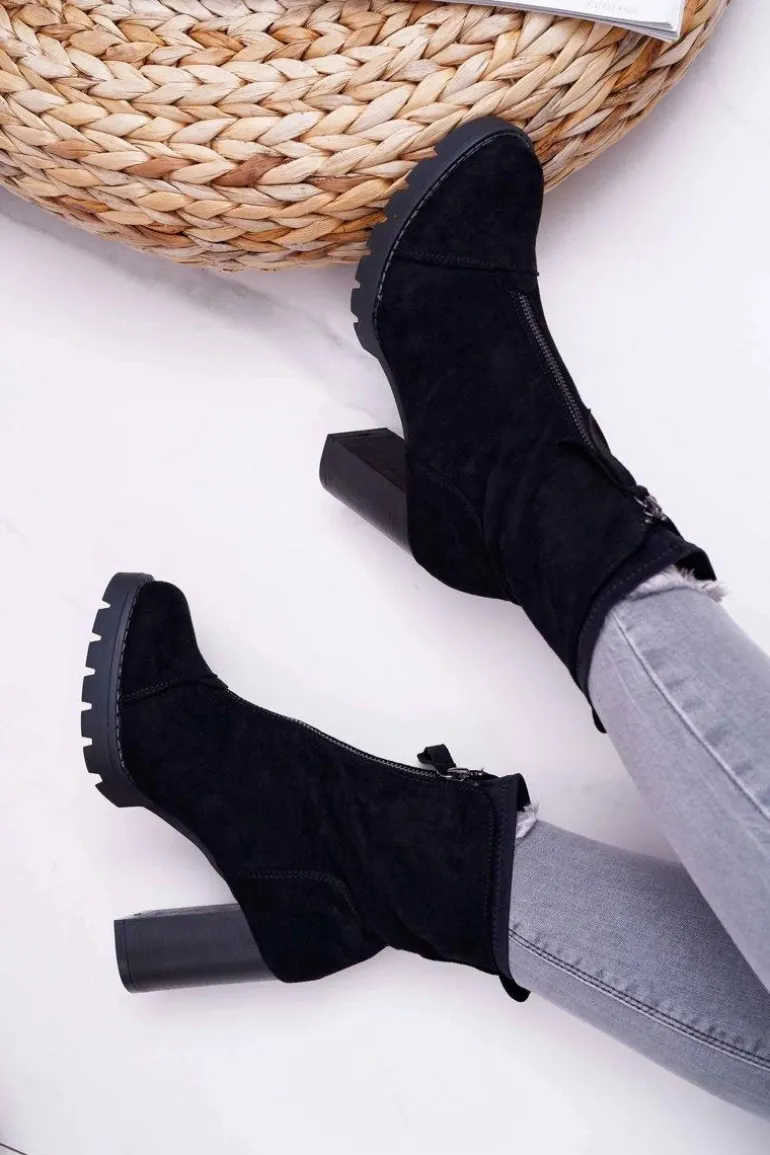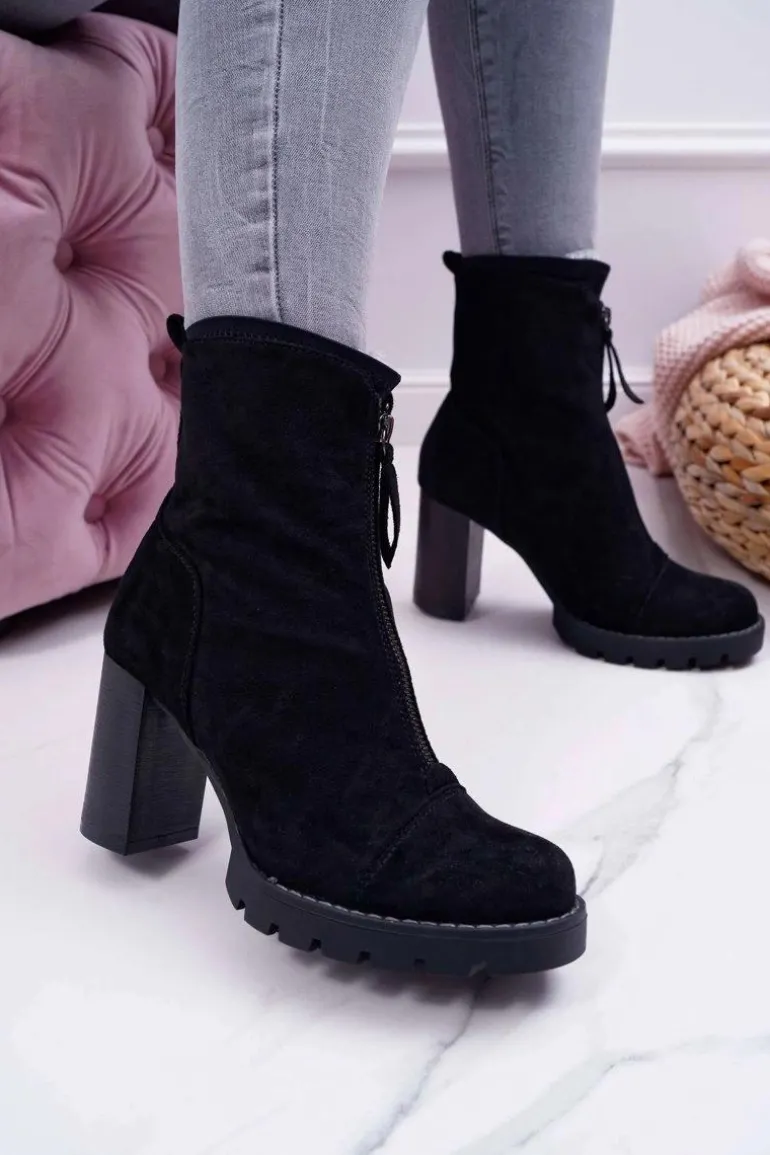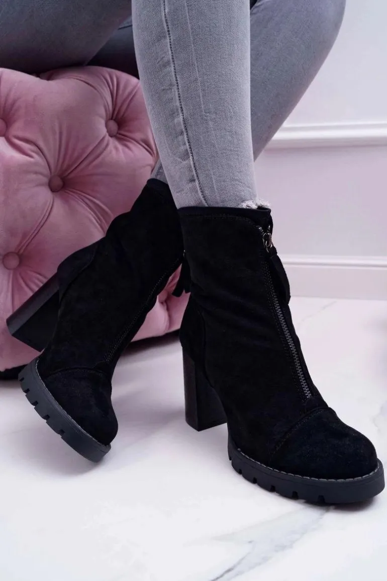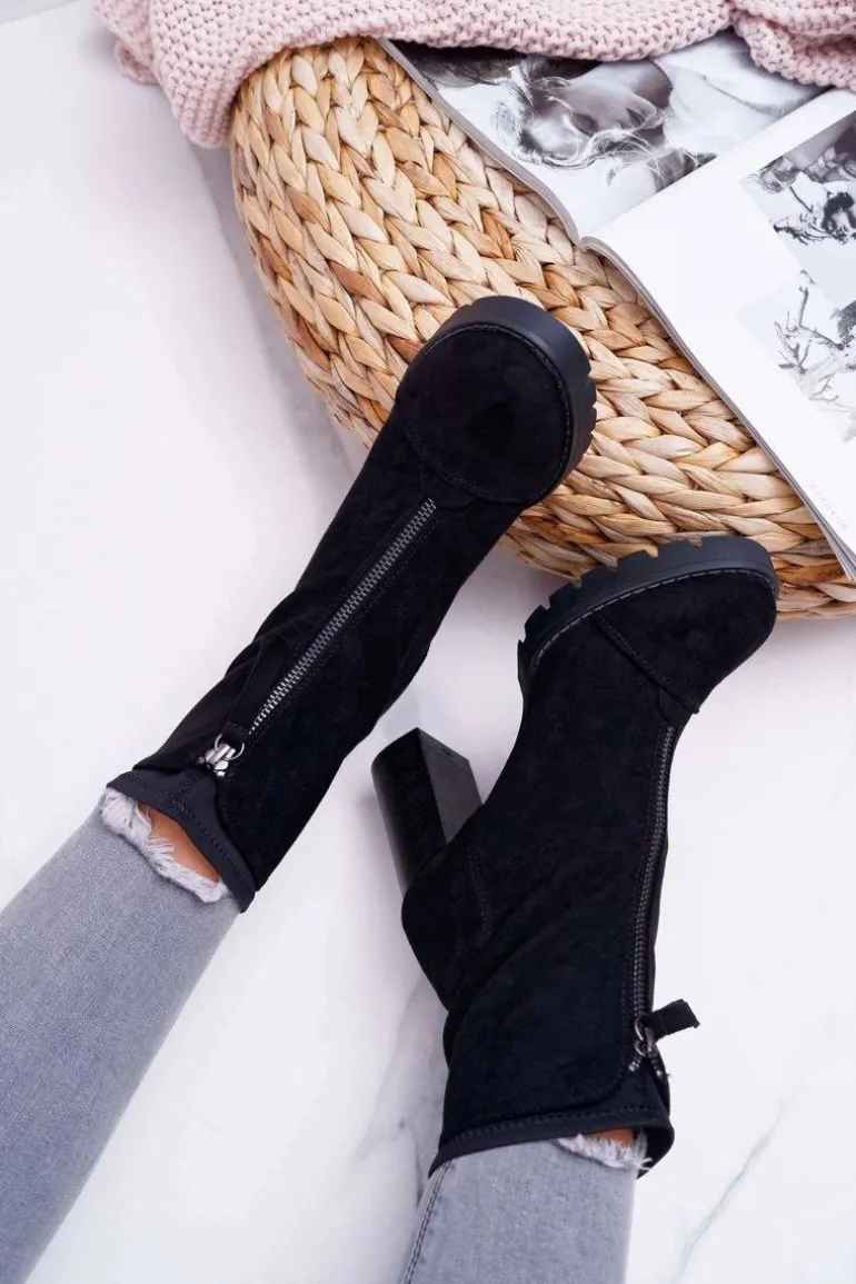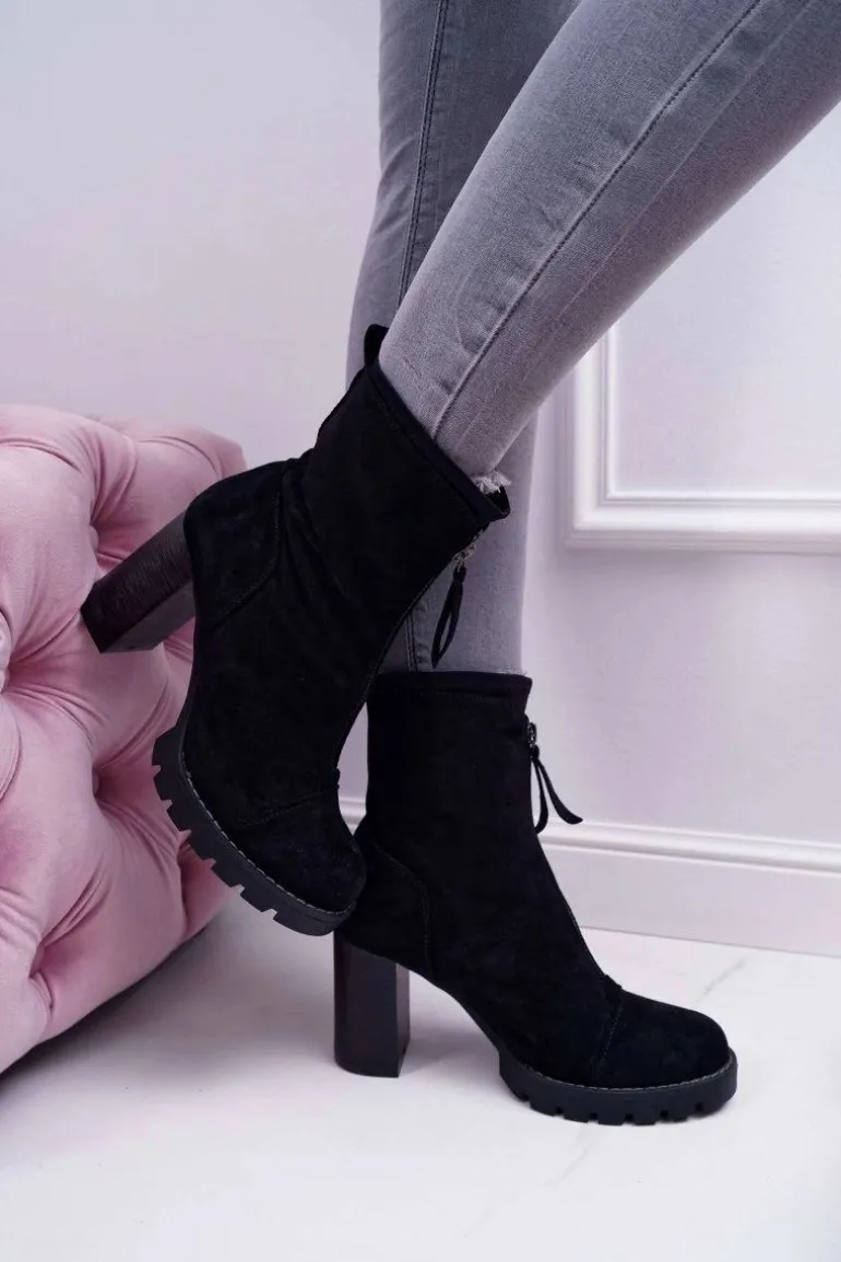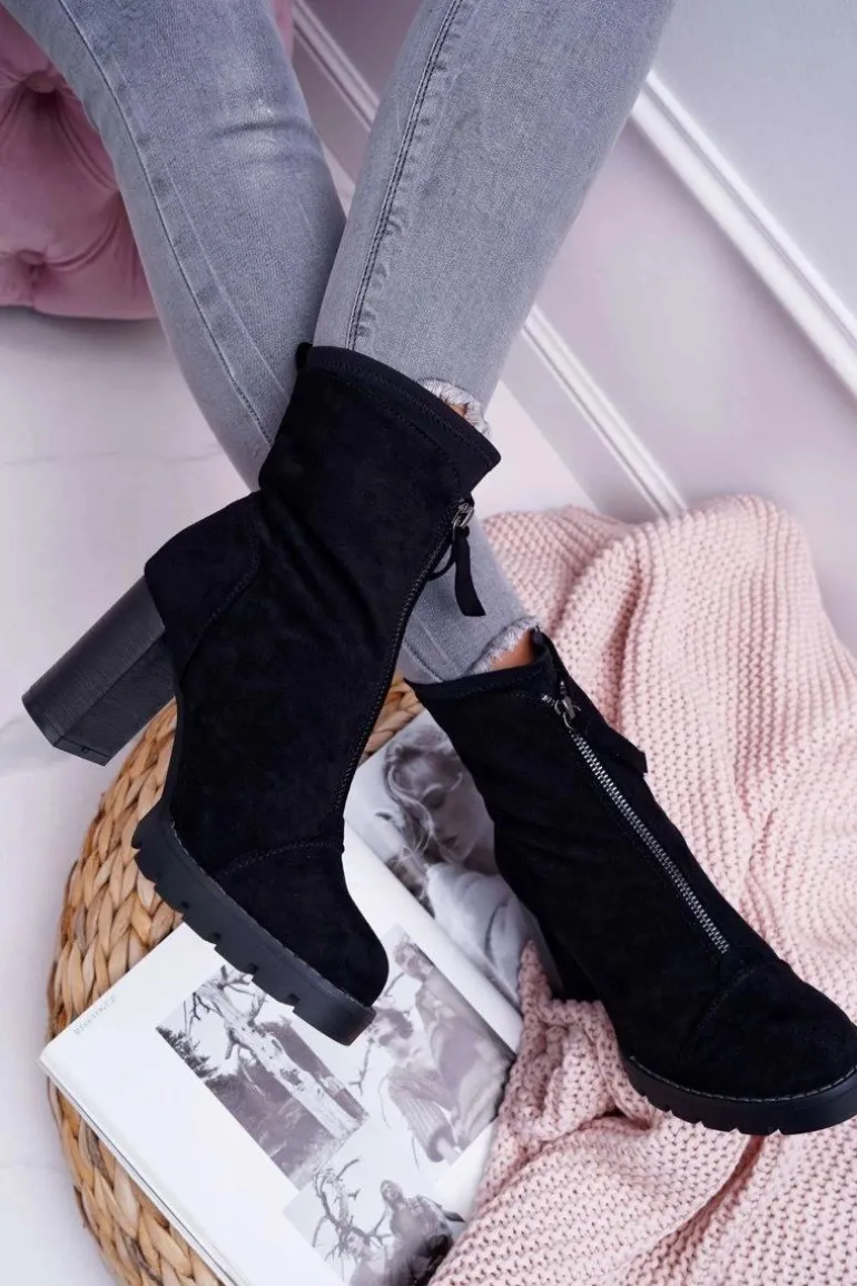 Botki na słupku wykonane z eko-zamszu z pewnością są i będą hitem stylizacji jeszcze przez długi czas! Nie może ich zabraknąć w Naszych stylizacjach. Zdobienie w postaci suwaka na przedniej części cholewki sprawia że nie można oderwać od nich oczu a dodatkowo ułatwi nam zakładanie. Przy wyborze rozmiaru prosimy sugerować się tabelą rozmiarów