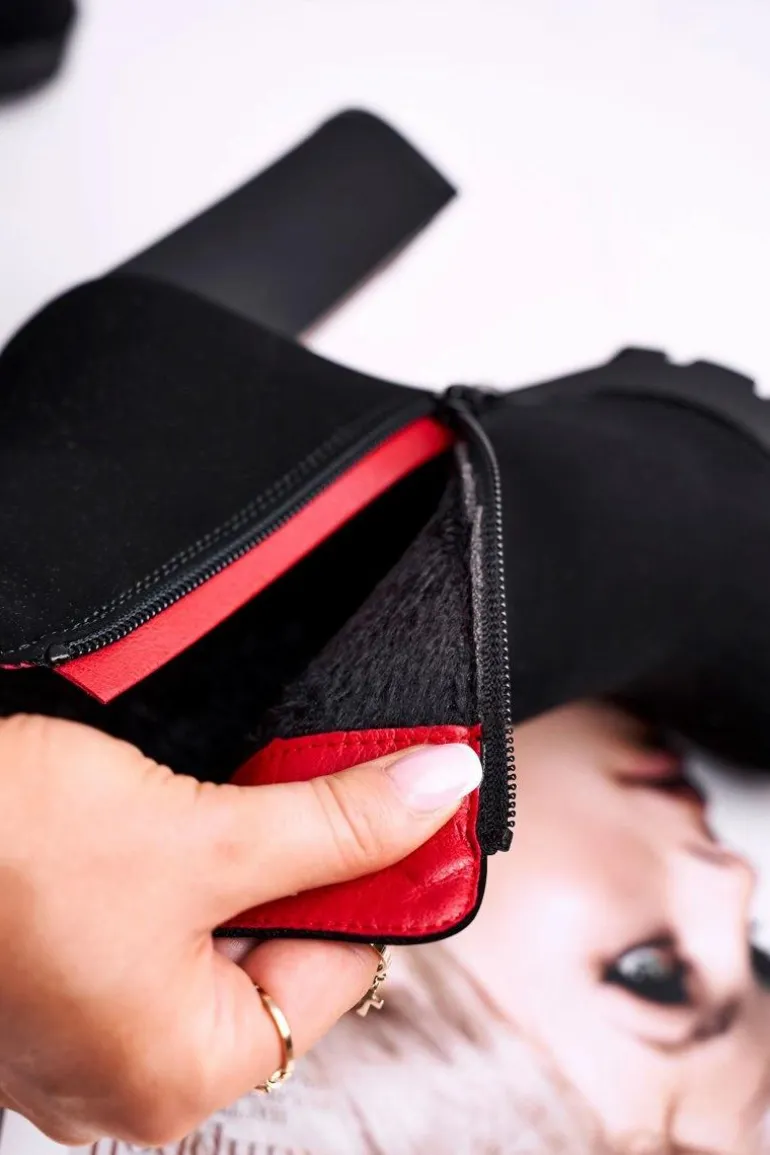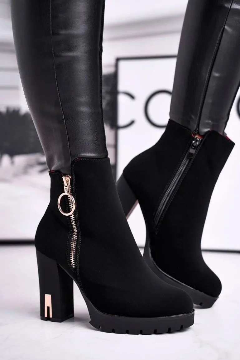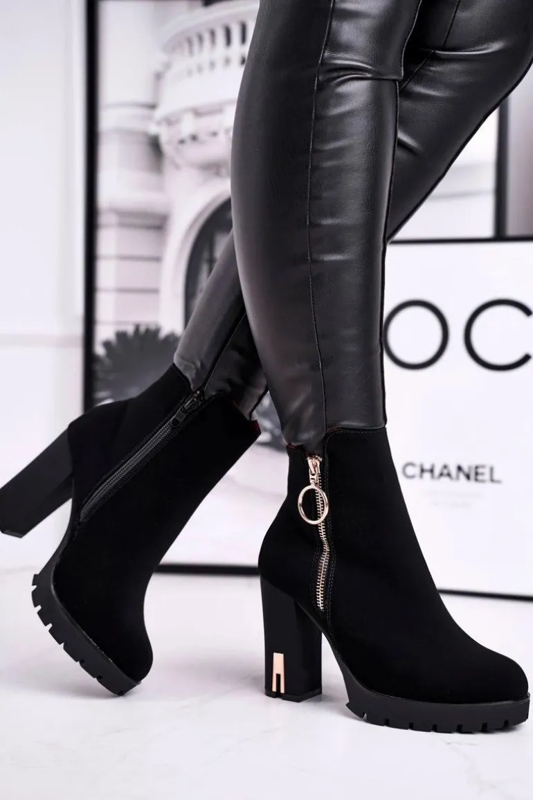 Czarne botki to klasyka gatunku wśród butów na chłodniejsze dni. Matowy słupek ze złotą wstawką, 2cm platforma oraz dwa suwaki na cholewce – brzmią bardzo zachęcająco! Jeden suwak ułatwi Ci zakładanie natomiast drugi, złoty, jest przepięknym dodatkiem. Wnętrze buta ocieplone kocem obuwniczym – gwarantującym komfort nawet w te najchłodniejsze dni. Przy wyborze rozmiaru prosimy sugerować się tabelą rozmiarów.