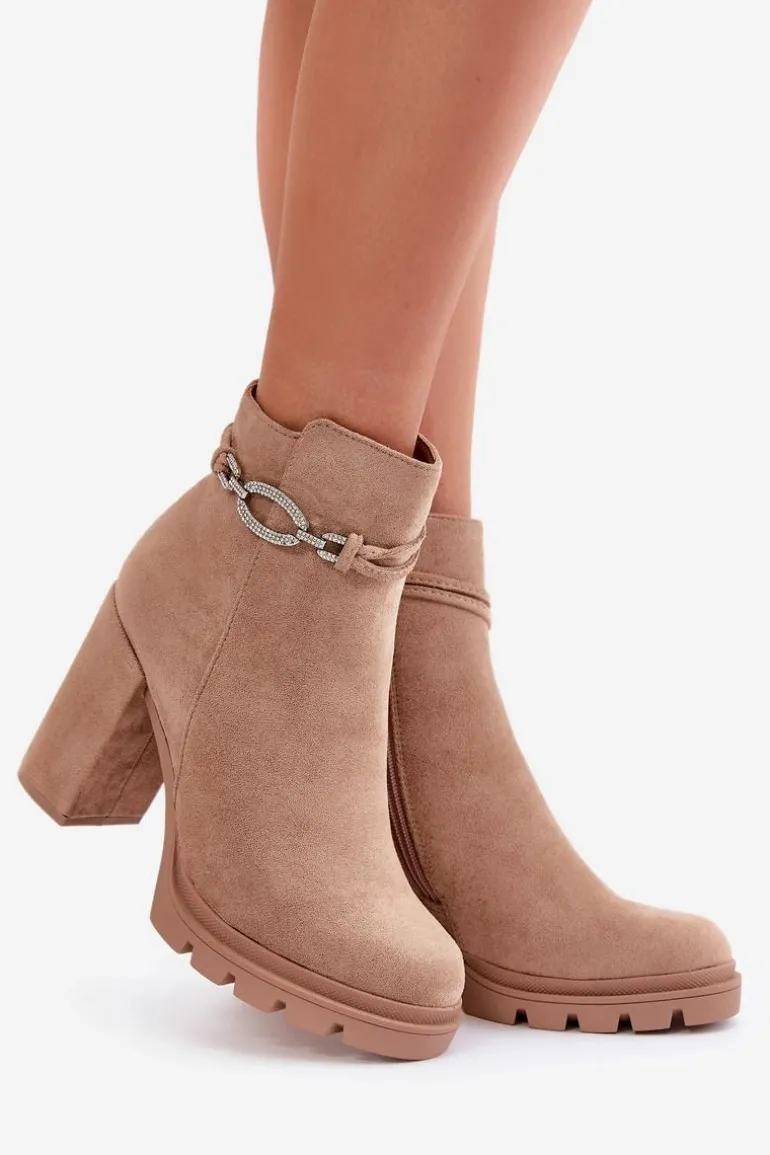 Botki z eko zamszu na wysokim obcasie typu słupek. Zapinane na zamek, co ułatwia zakładanie i zdejmowanie obuwia. Wnętrze ocieplone jest kocem obuwniczym, co gwarantuje komfort w zimniejsze dni. Cholewka ozdobiona jest eleganckim paskiem, który dodaje im stylu i charakteru. Noski zaokrąglone. Przy wyborze rozmiaru prosimy sugerować się tabelą rozmiarów.