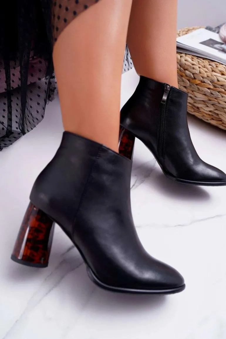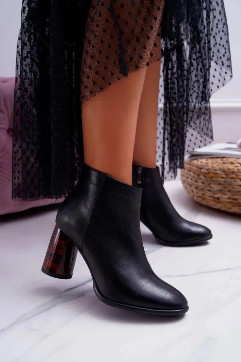Botki Damskie Na Słupku Laura Messi Skórzane Czarne 2056