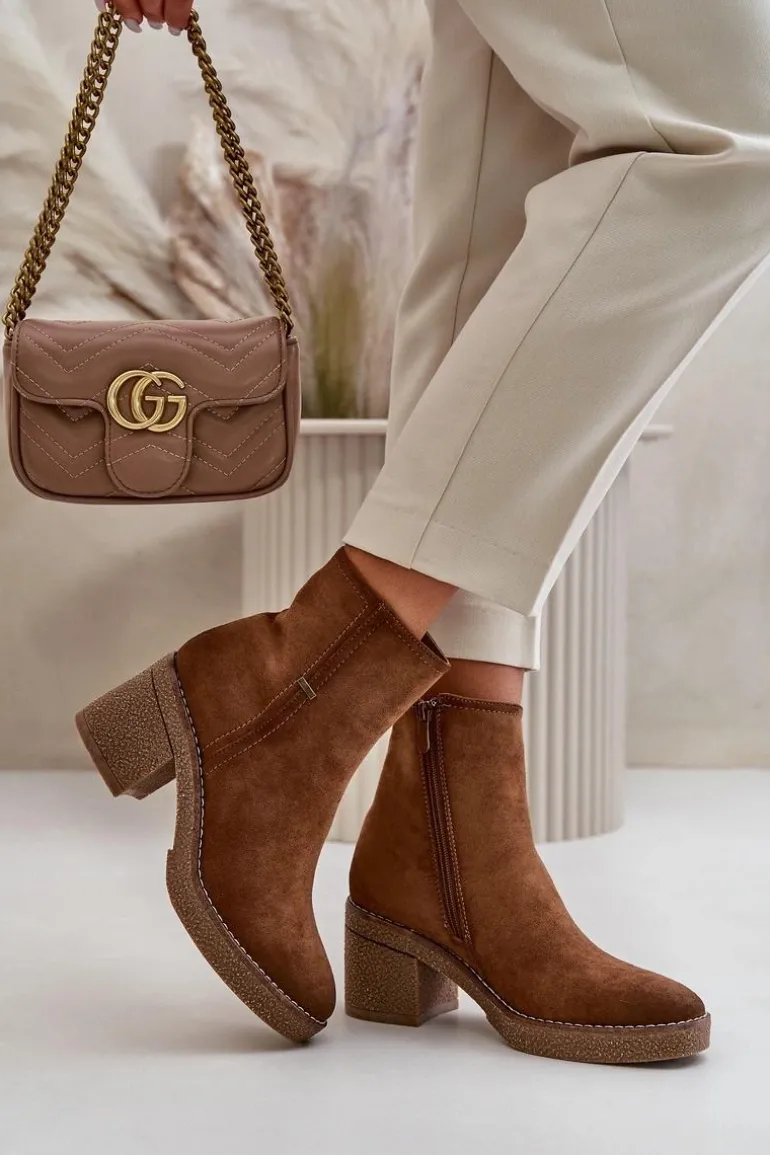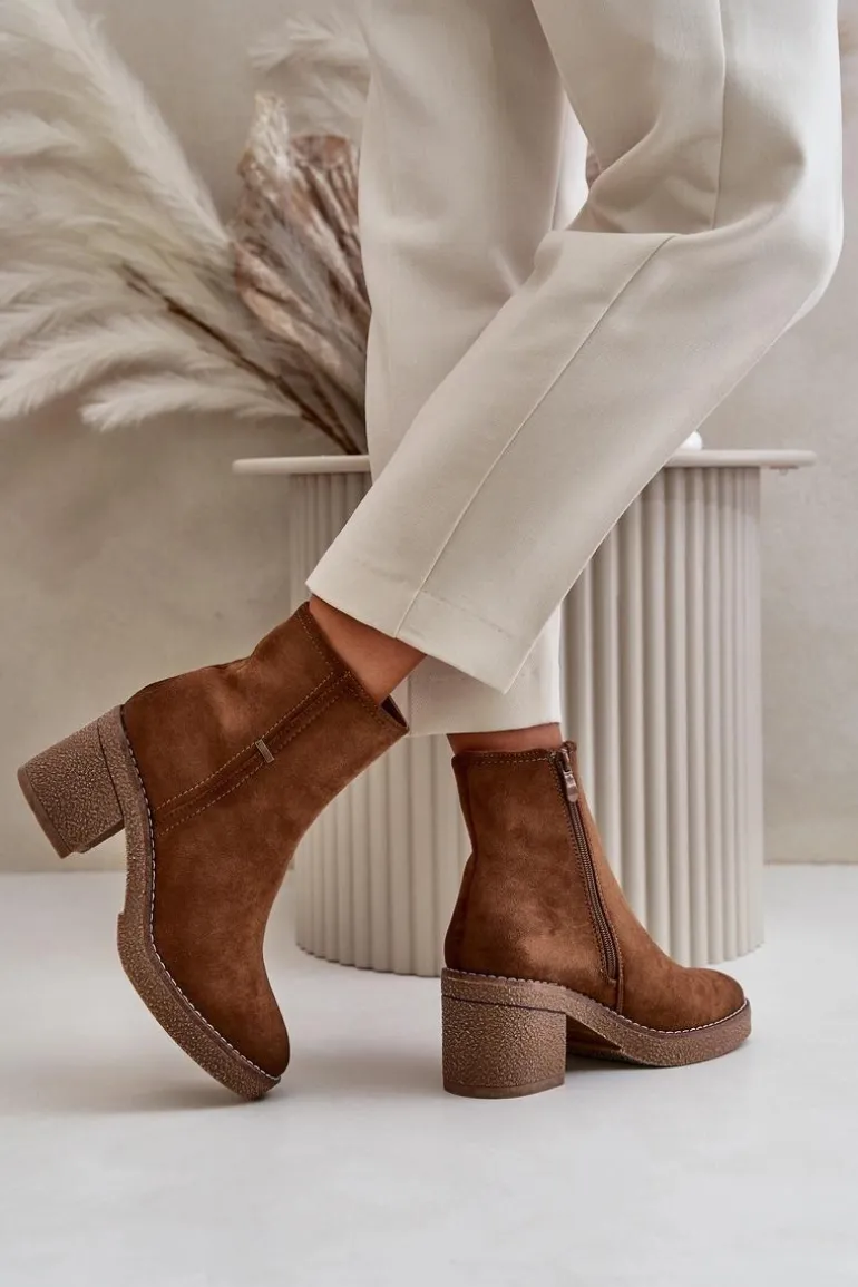 Damskie botki z eko zamszu, który jest miękki i przyjemny w dotyku. Osadzone na stabilnym obcasie w formie słupka, co zapewnia wygodę i pewność chodzenia przez cały dzień, jednocześnie dodając kilka centymetrów wzrostu i podkreślając sylwetkę. Wnętrze ocieplone jest kocem obuwniczym, który zapewnia ciepło i komfort w chłodniejsze dni, chroniąc stopy przed zimnem. Dzięki zapięciu na zamek, ich zakładanie i zdejmowanie jest szybkie i bezproblemowe, co jest dużym atutem w codziennym użytkowaniu. Przy wyborze rozmiaru prosimy sugerować się tabelą rozmiarów.