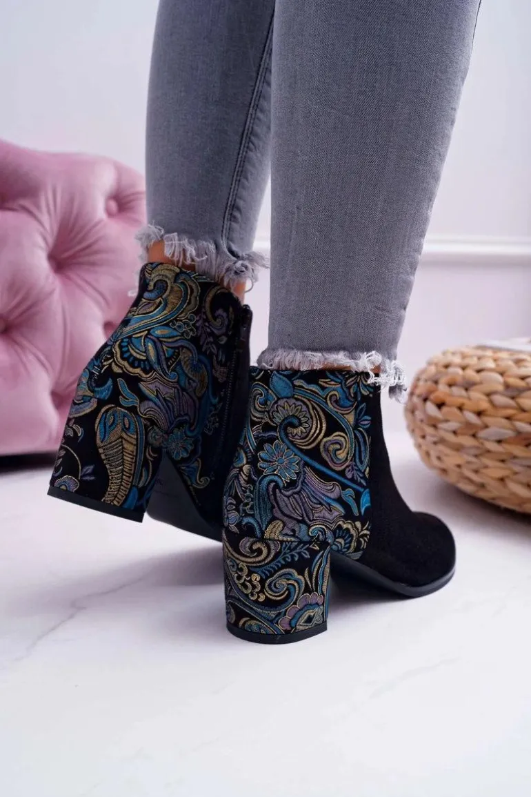 Botki Damskie Na Słupku Sergio Leone W Kwiaty Folk Czarne Eros2