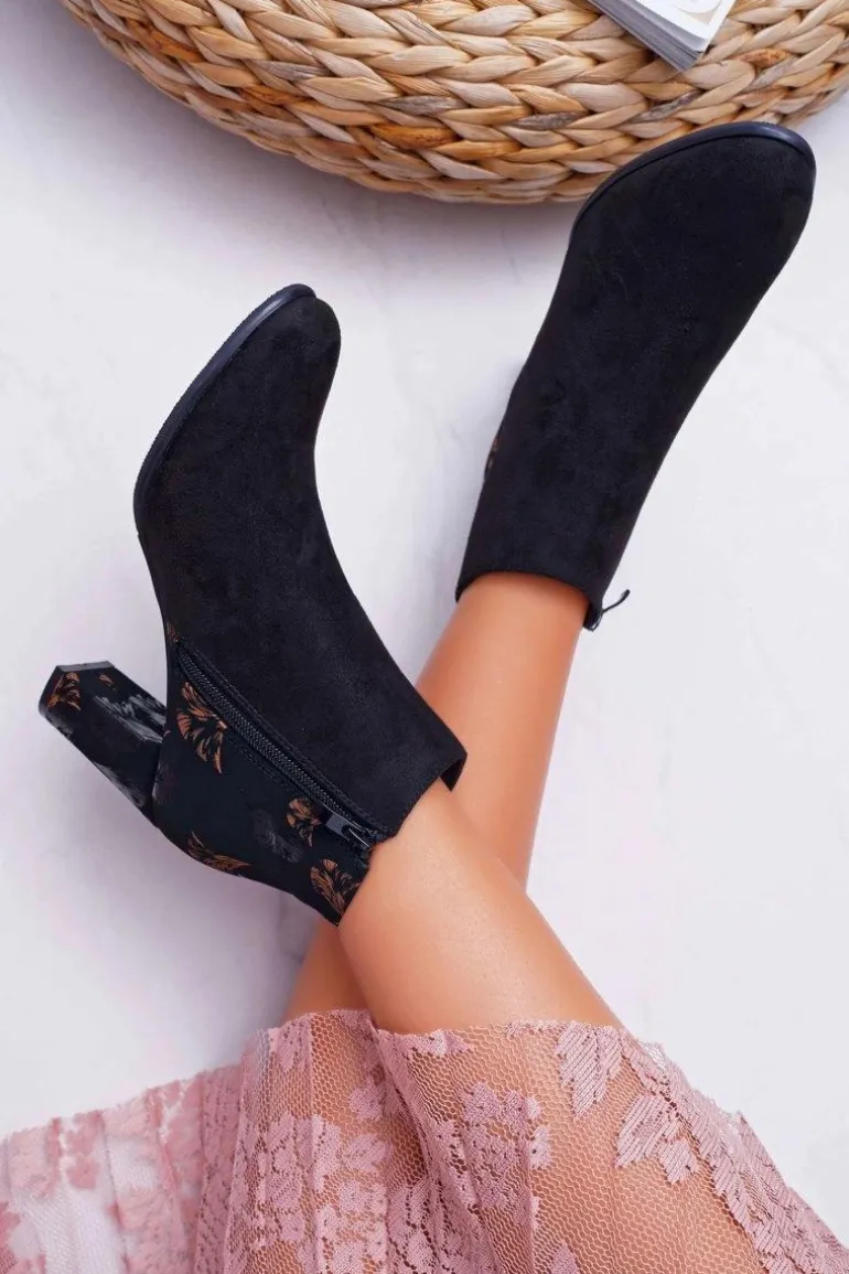 Botki Damskie Na Słupku Sergio Leone W Złote Kwiaty Folk Czarne Eros2