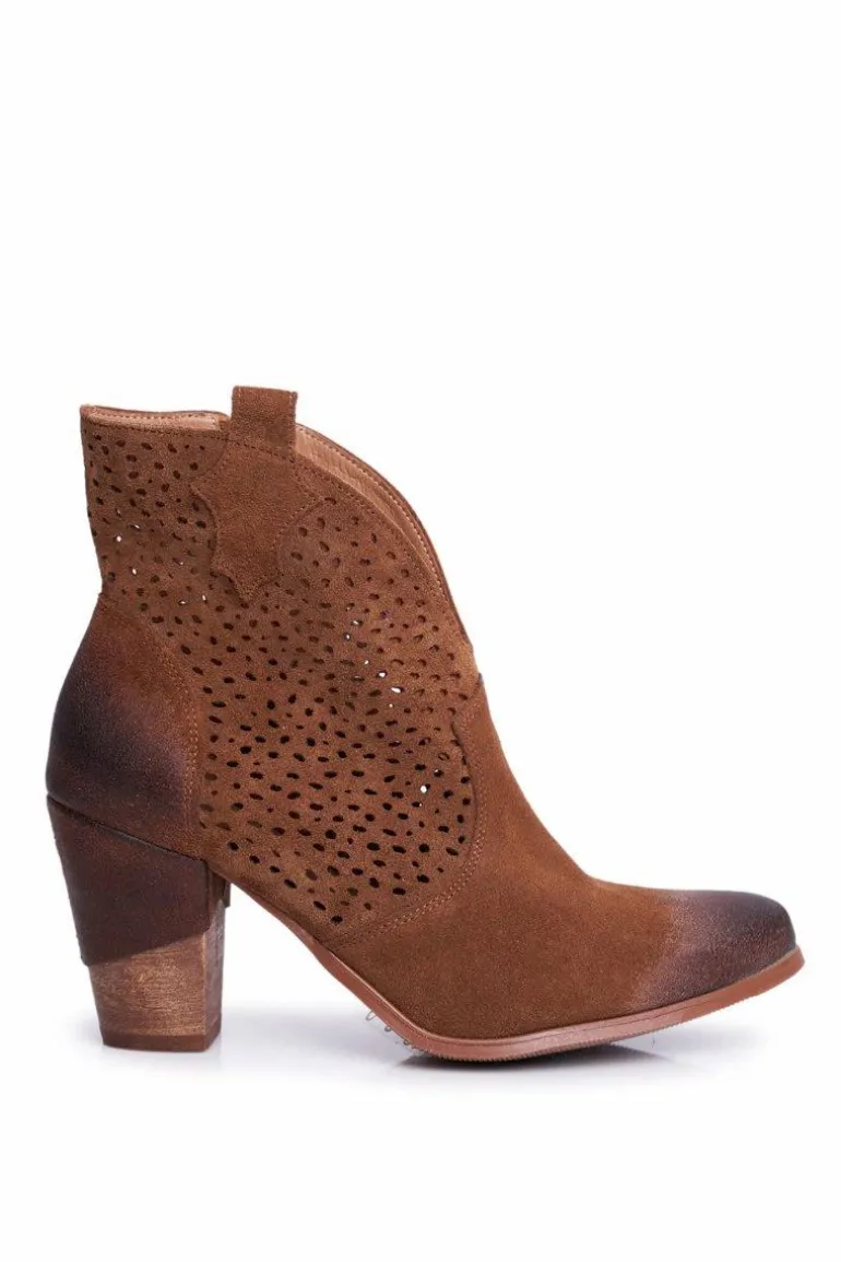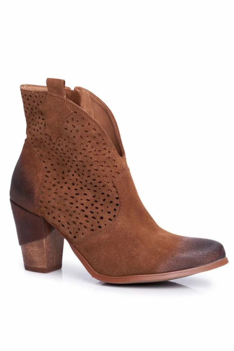 Botki Damskie Na Słupku Skórzane Welurowe Kowbojki Exquisite Brązowe 1170