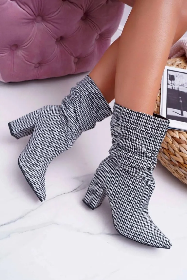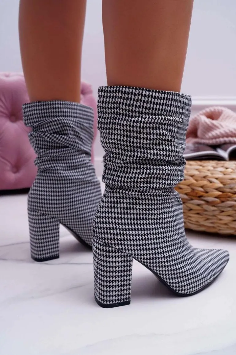 Botki Damskie Na Słupku w Pepitkę Biało Czarne Vibe