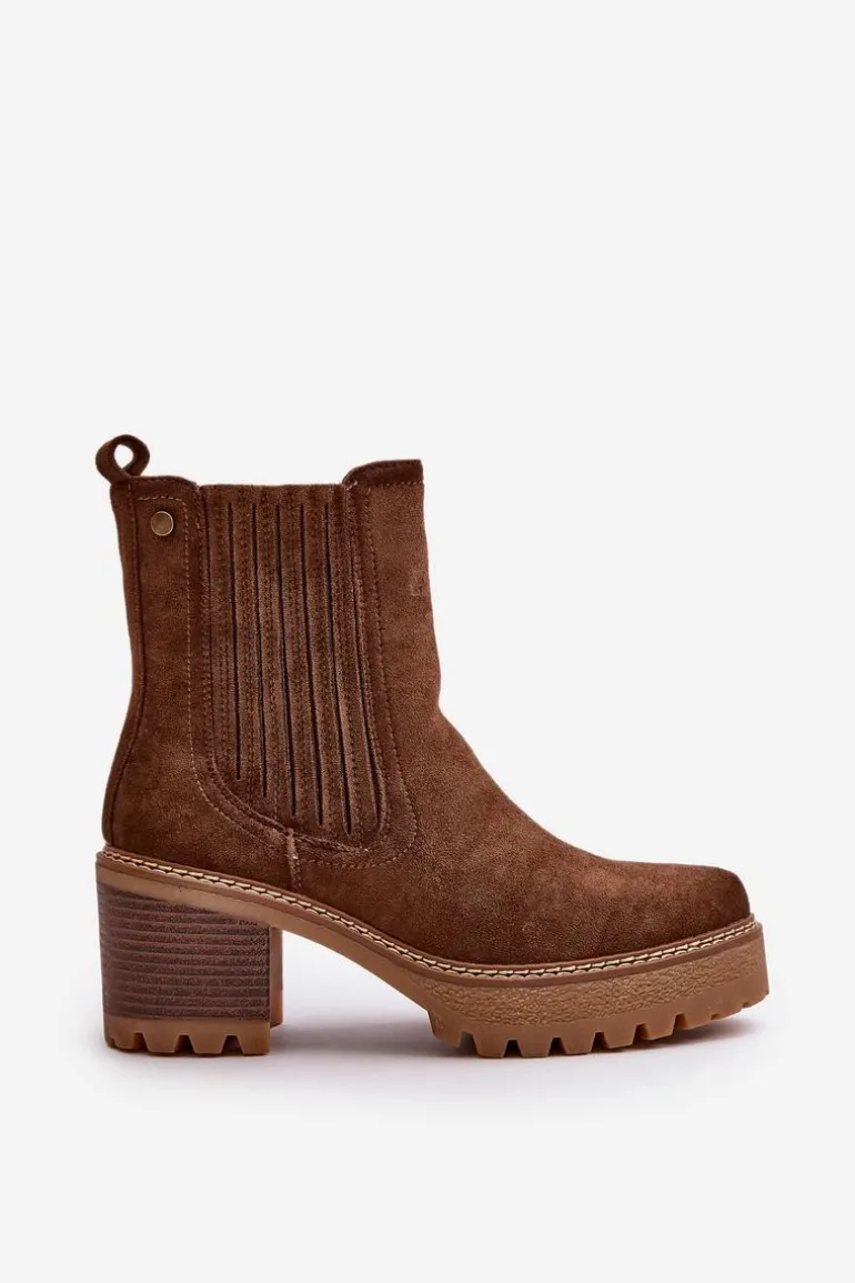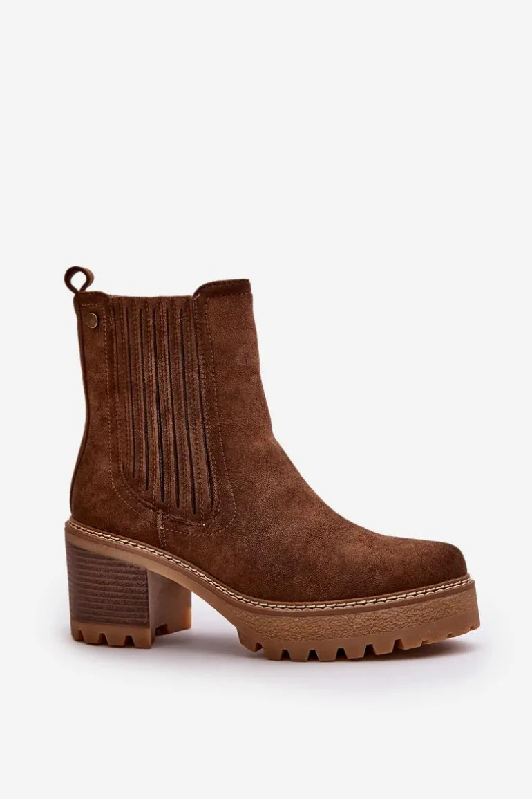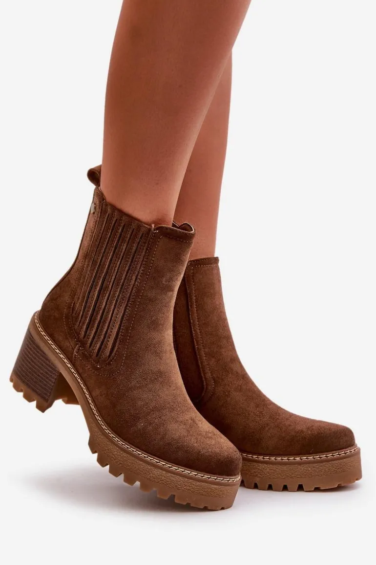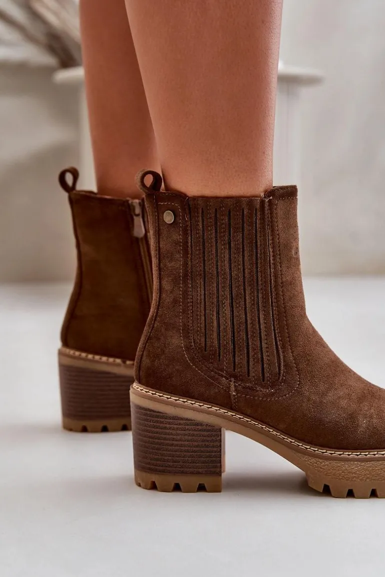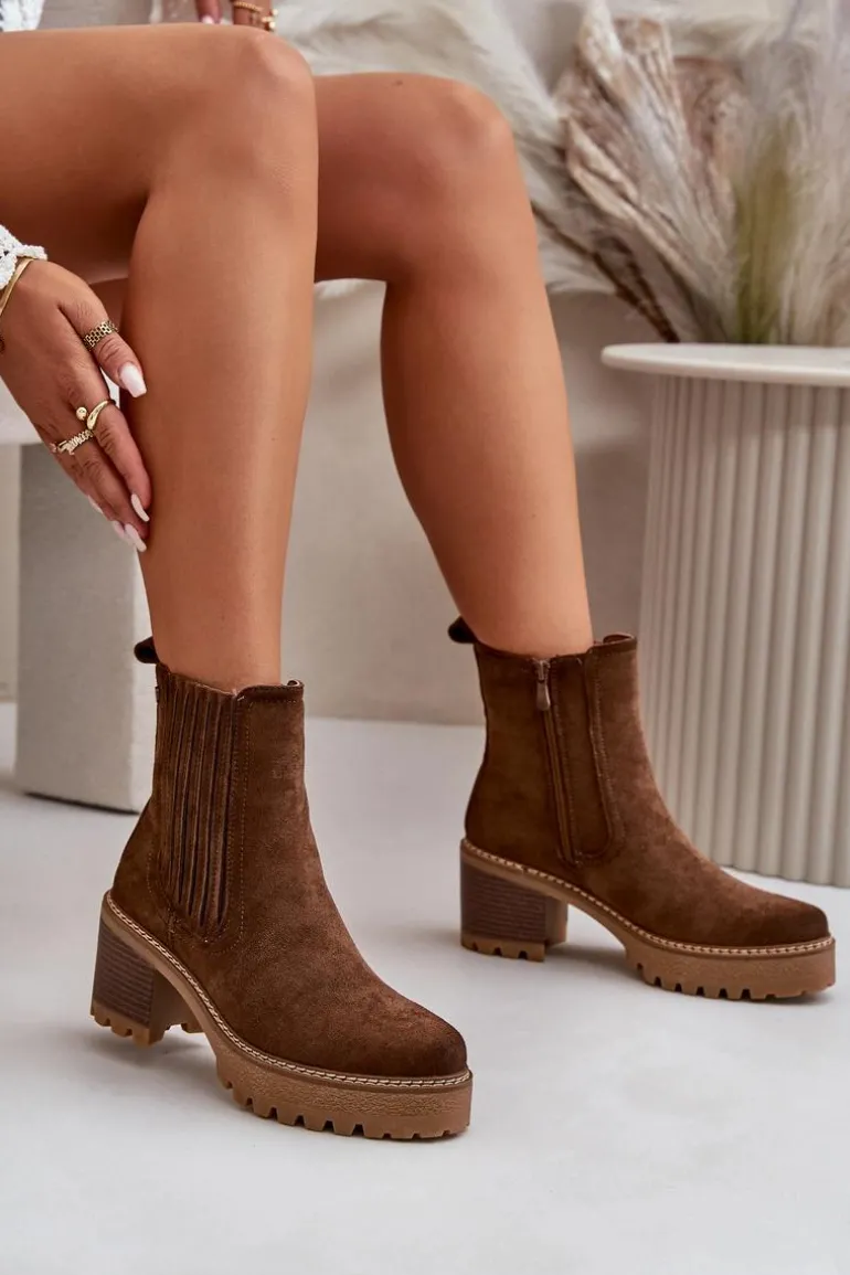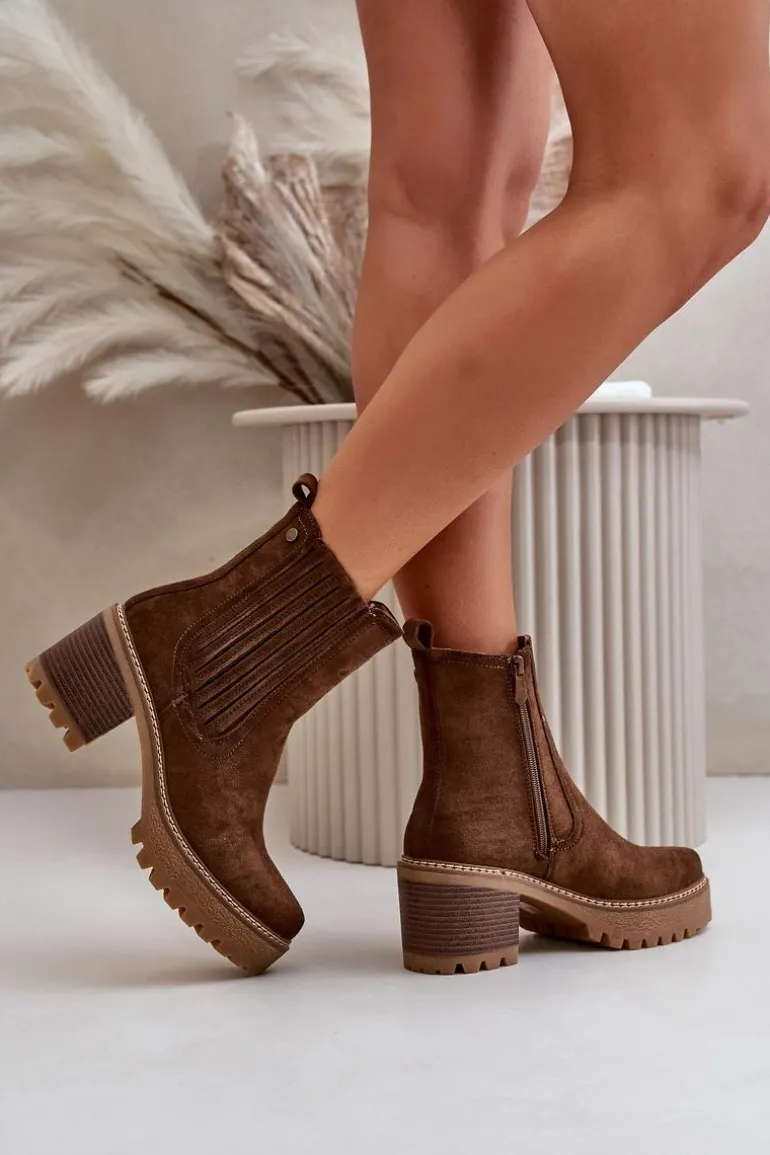 Damskie botki wykonane z eko zamszu. Osadzone na stabilnym obcasie w formie słupka. Środek ocieplony kocem obuwniczym, co zapewnia ciepło i komfort noszenia. Model ten zapinany jest na zamek, co ułatwia zakładanie i zdejmowanie. Noski zaokrąglone. Idealne do jesiennych i zimowych stylizacji. Przy wyborze rozmiaru prosimy sugerować się tabelą rozmiarów.