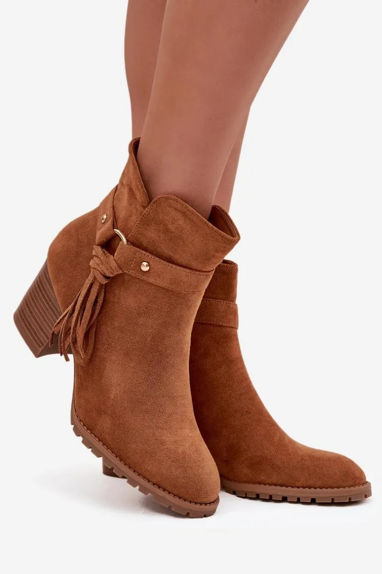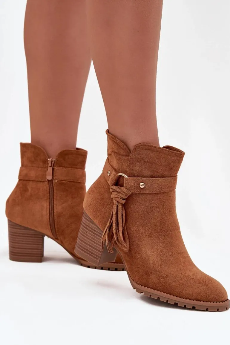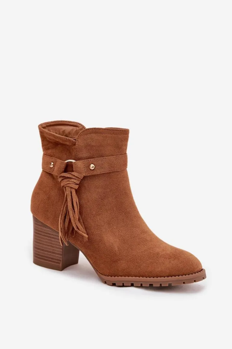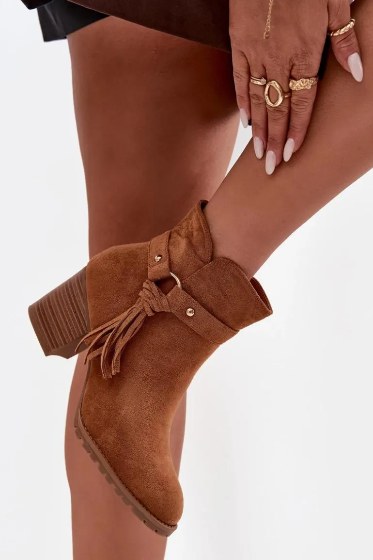 Botki damskie wykonane z eko zamszu. Klasyczny fason z zaokrąglonymi noskami został urozmaicony paskiem z frędzlami, nadającym butom oryginalności. Model osadzony na stabilnym obcasie typu słupek pięknie wysmukla sylwetkę, a jednocześnie zapewnia komfort podczas codziennego noszenia. Praktyczne zapięcie na zamek ułatwia zakładanie i zdejmowanie, dzięki czemu botki są wygodne w użytkowaniu. To obuwie, które doskonale sprawdzi się w sezonie jesienno-zimowym, stanowiąc stylowe dopełnienie zarówno casualowych, jak i bardziej eleganckich zestawów.