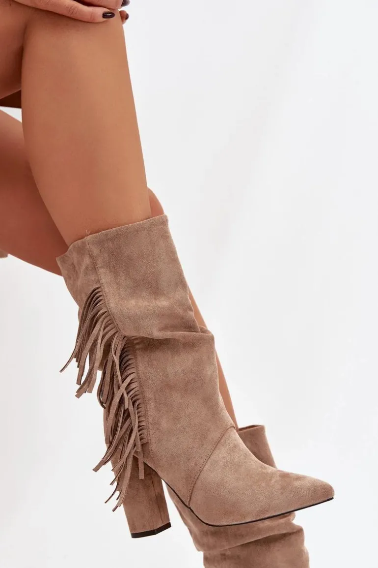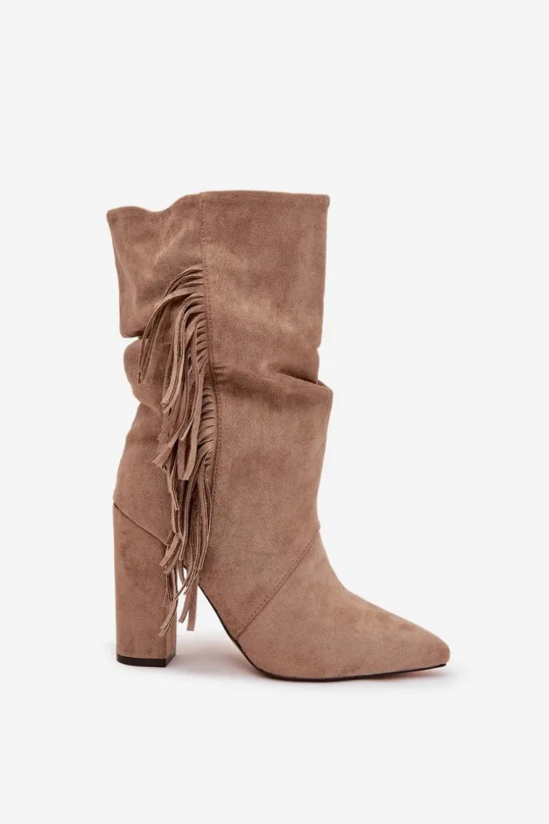 Botki damskie na słupku z frędzlami i marszczeniem ocieplane czekoladowe Darlina
