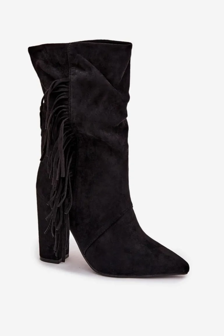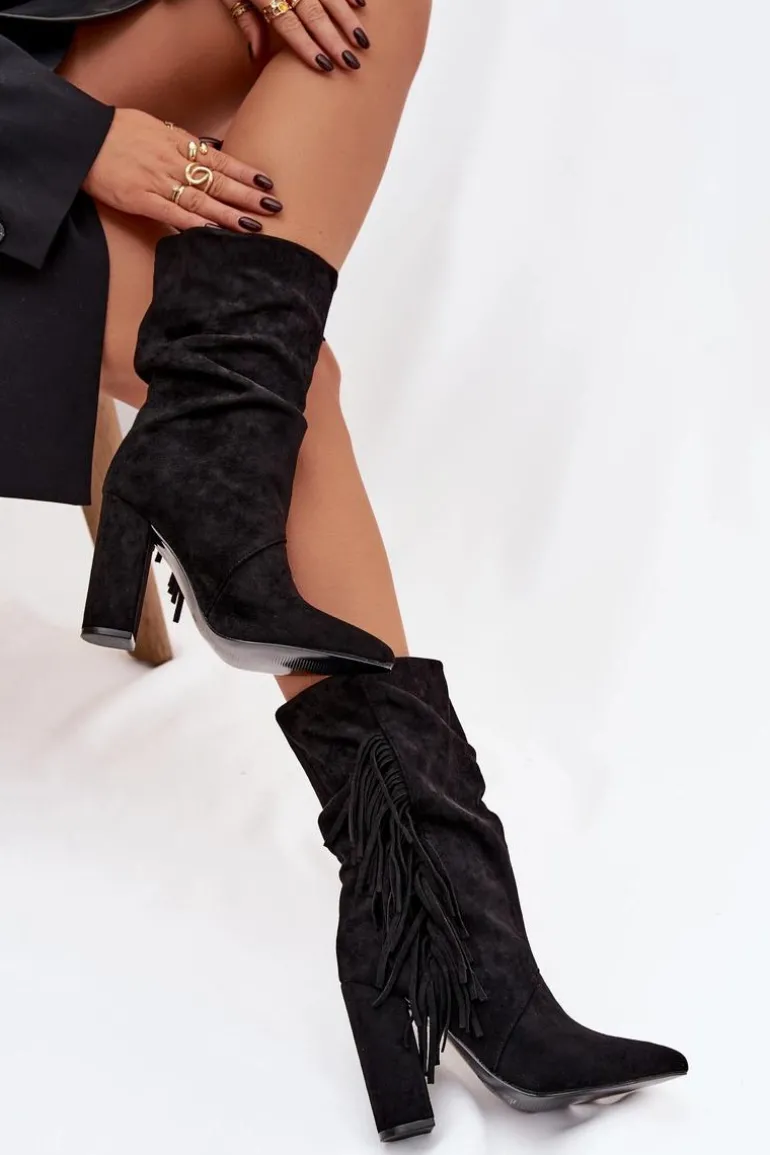 Botki damskie na słupku z frędzlami i marszczeniem ocieplane czekoladowe Darlina