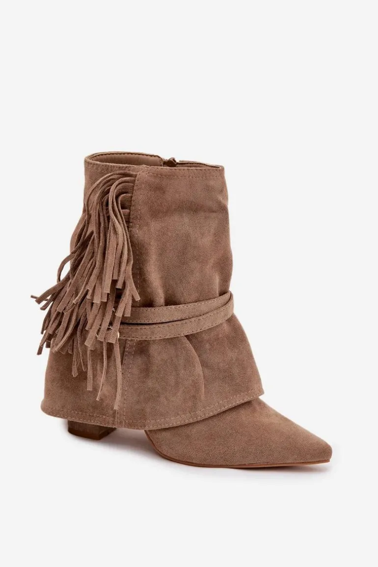 Damskie botki z eko zamszu to idealne połączenie stylu i oryginalnych detali, które przyciągają uwagę. Cholewka nachodząca na obcas subtelnie wysmukla sylwetkę, a szpiczaste noski dodają elegancji i kobiecego charakteru. Model ozdobiony frędzlami oraz cienkimi paseczkami ze złotymi klamrami wprowadza modowy akcent, nadając wyjątkowego, nowoczesnego wyglądu. Botki doskonale sprawdzą się w casualowych zestawach, jak i w bardziej wyjściowych stylizacjach, wprowadzając do nich nutę oryginalności i szyku. Komfortowe i efektowne, stanowią świetny wybór na co dzień i na specjalne okazje.Przy wyborze rozmiaru prosimy sugerować się tabelą rozmiarów.