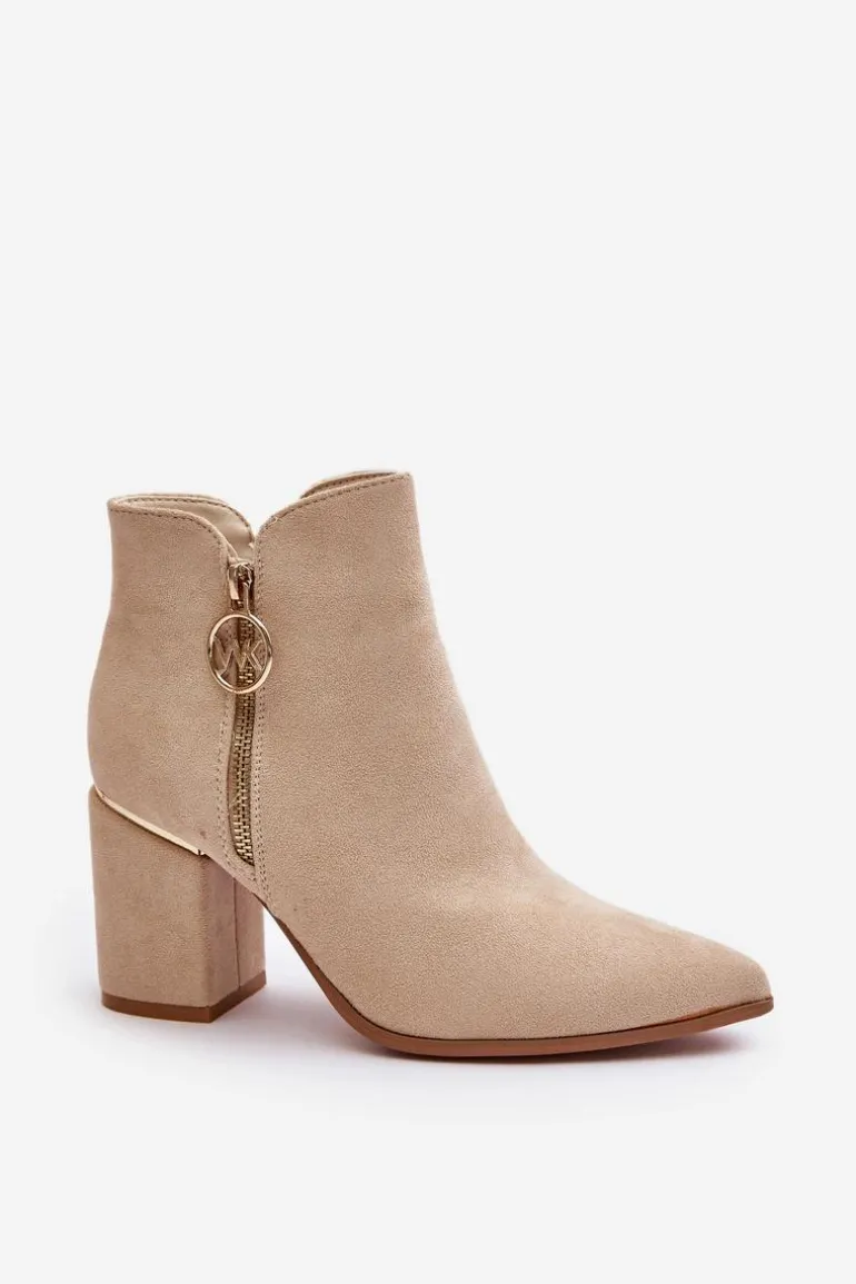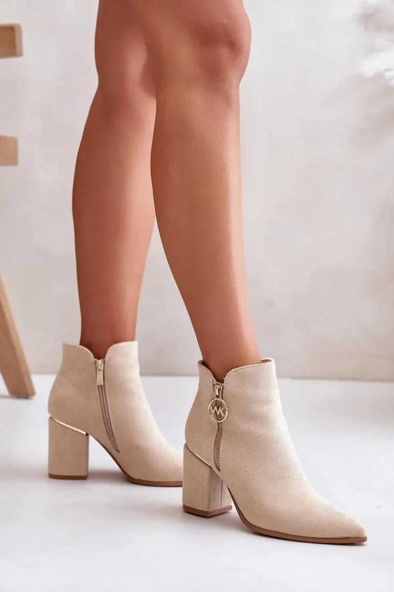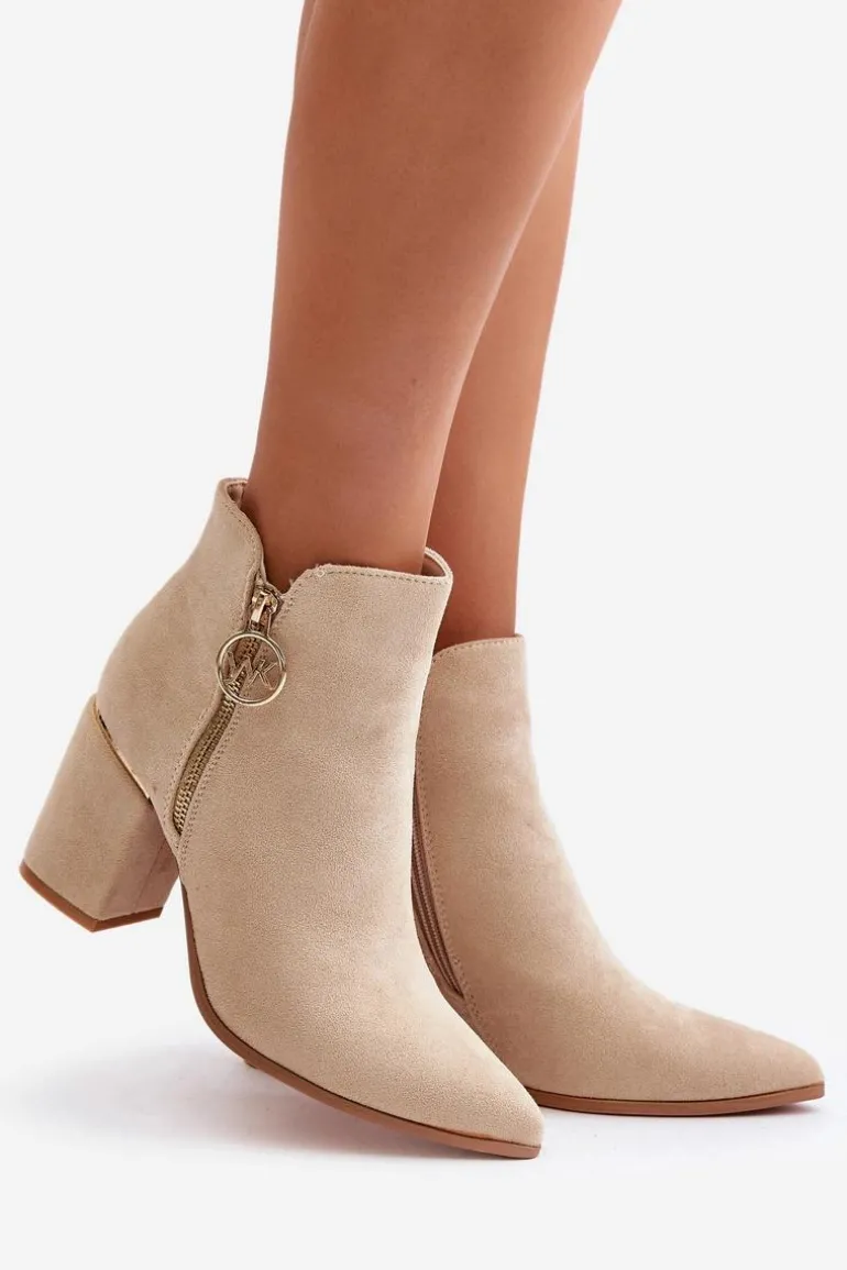 Eleganckie botki z eko zamszu, osadzone na obcasie typu słupek. Wyróżniają się spiczastymi noskami, które nadają im szyku. Wnętrze jest ocieplone, zapewniając komfort w chłodniejsze dni. Zapinane na zamek z boku, dodatkowo ozdobione złotym zamkiem, co dodaje wyjątkowego stylu. Przy wyborze rozmiaru prosimy sugerować się tabelą rozmiarów.