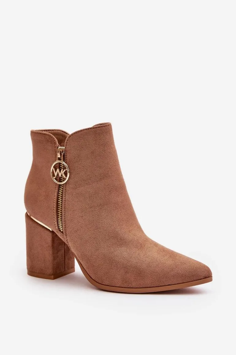 Eleganckie botki z eko zamszu, osadzone na obcasie typu słupek. Wyróżniają się spiczastymi noskami, które nadają im szyku. Wnętrze jest ocieplone, zapewniając komfort w chłodniejsze dni. Zapinane na zamek z boku, dodatkowo ozdobione złotym zamkiem, co dodaje wyjątkowego stylu. Przy wyborze rozmiaru prosimy sugerować się tabelą rozmiarów.