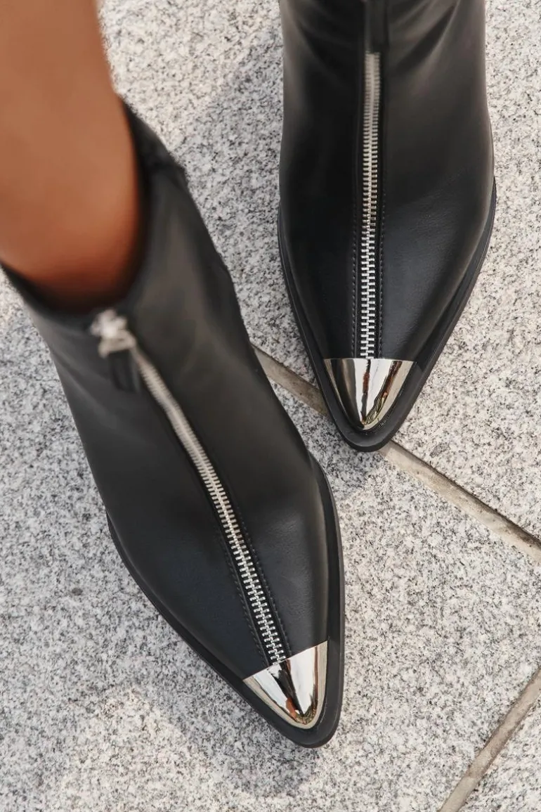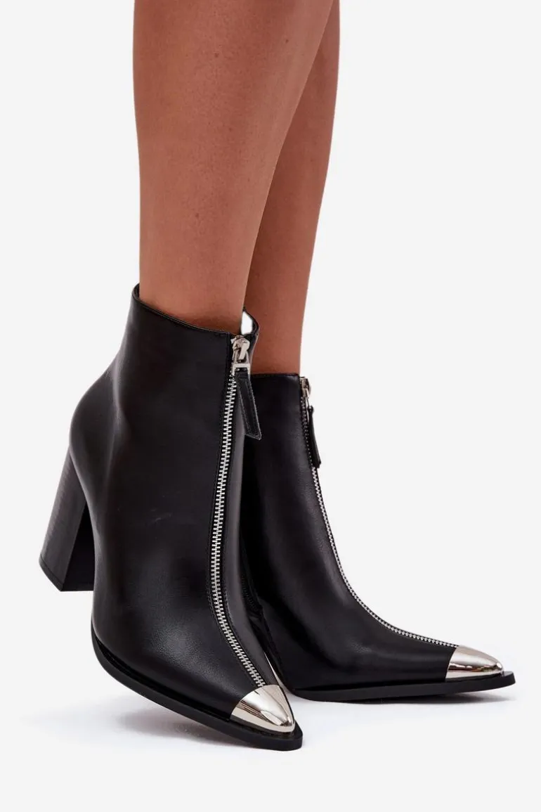 Botki damskie z eko skóry to stylowa propozycja na co dzień i do bardziej wyjściowych stylizacji. Model osadzony na stabilnym słupku zapewnia komfortowy krok, a zamek po boku ułatwia szybkie zakładanie i dopasowanie do stopy. Dodatkowy ozdobny zamek z przodu oraz subtelny metalowy detal nadają nowoczesnego charakteru. Przy wyborze rozmiaru prosimy sugerować się tabelą rozmiarów.