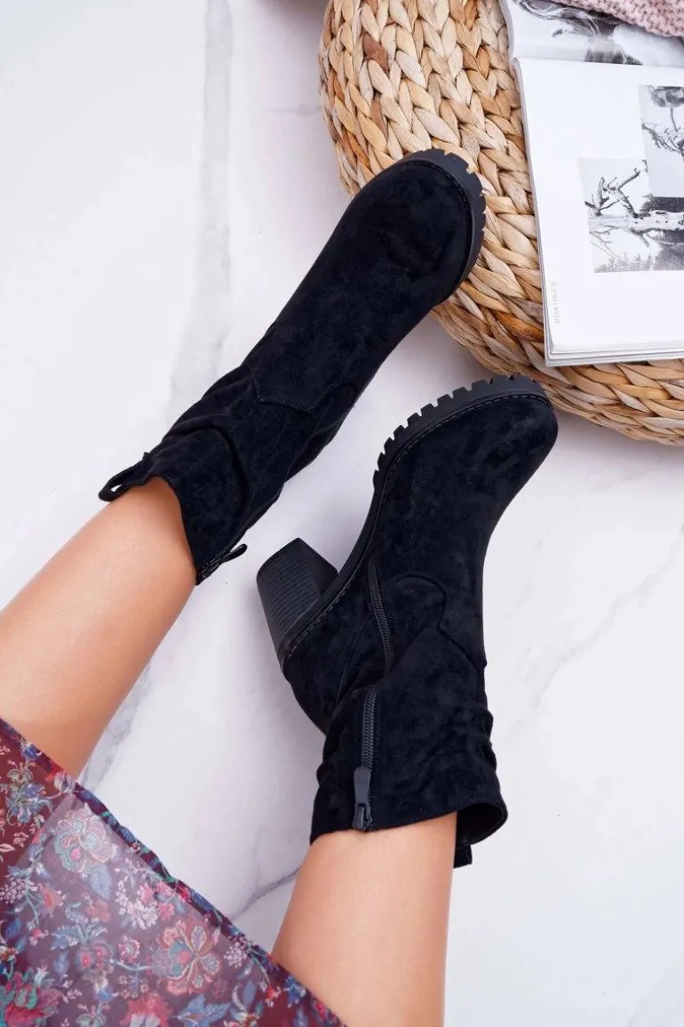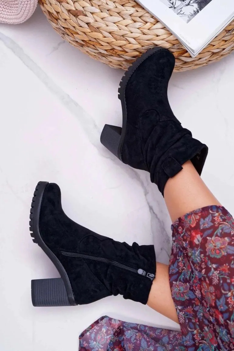 Botki na słupku wykonane z eko-zamszu. Stworzymy z nimi wiele wspaniałych stylizacji! Wnętrze pokryte kocem obuwniczym z krótkim włosiem, co zapewni nam komfort w każdych warunkach. Suwak po wewnętrznej stronie ułatwi nam zakładanie. Przy wyborze rozmiaru prosimy sugerować się tabelą rozmiarów