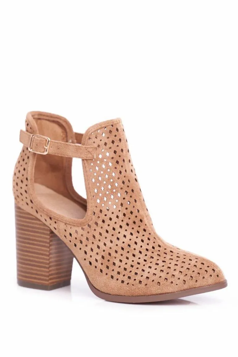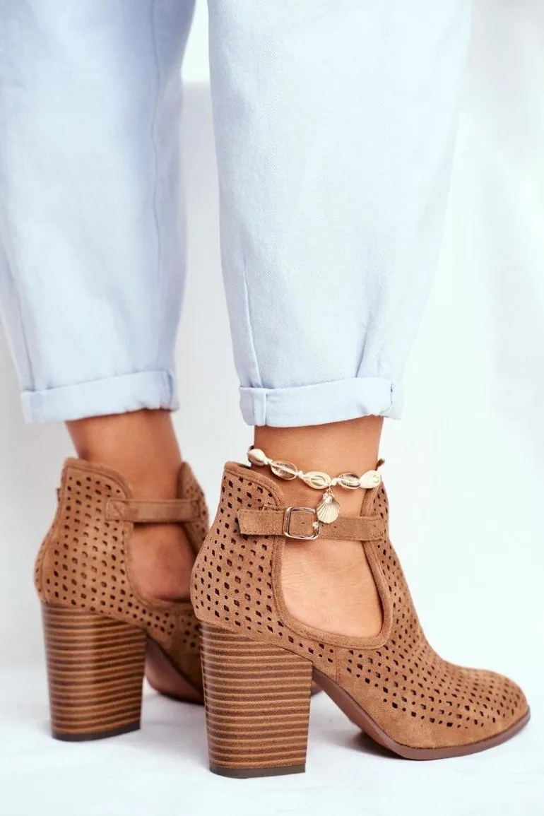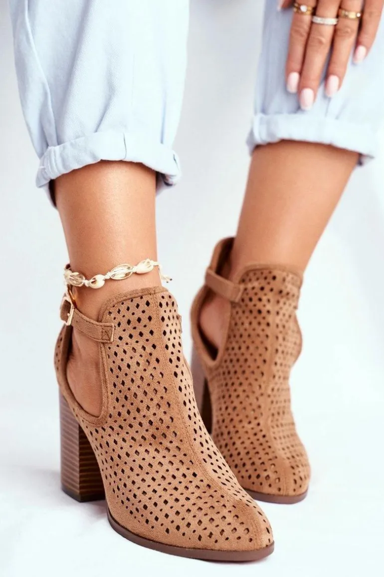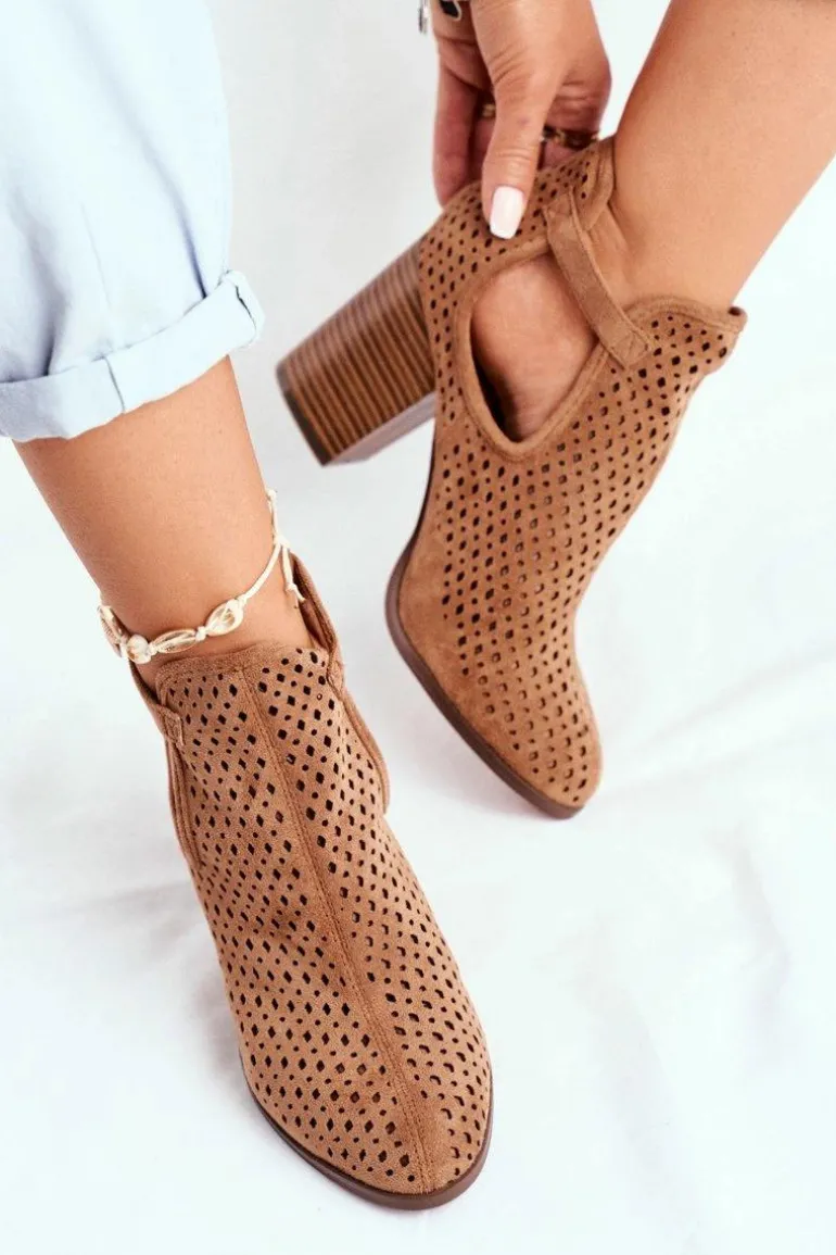 Botki Damskie Na Słupku Zamszowe Ażurowe Camel Morrena