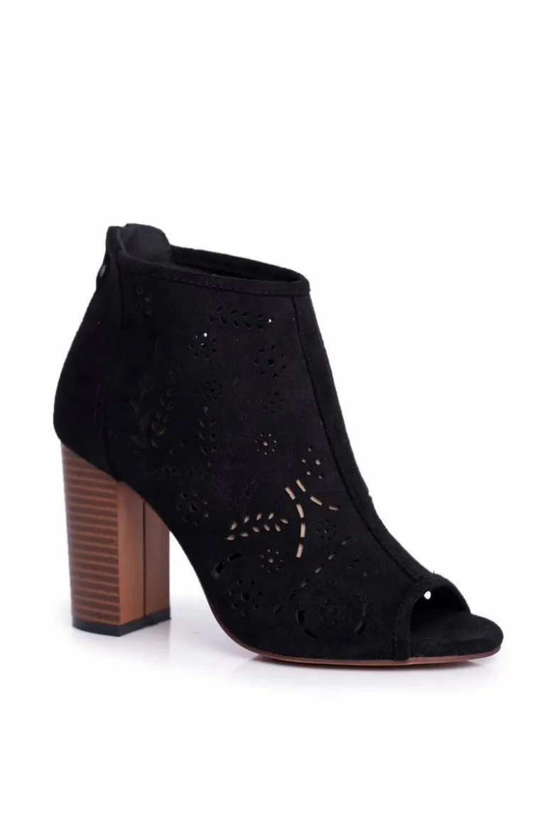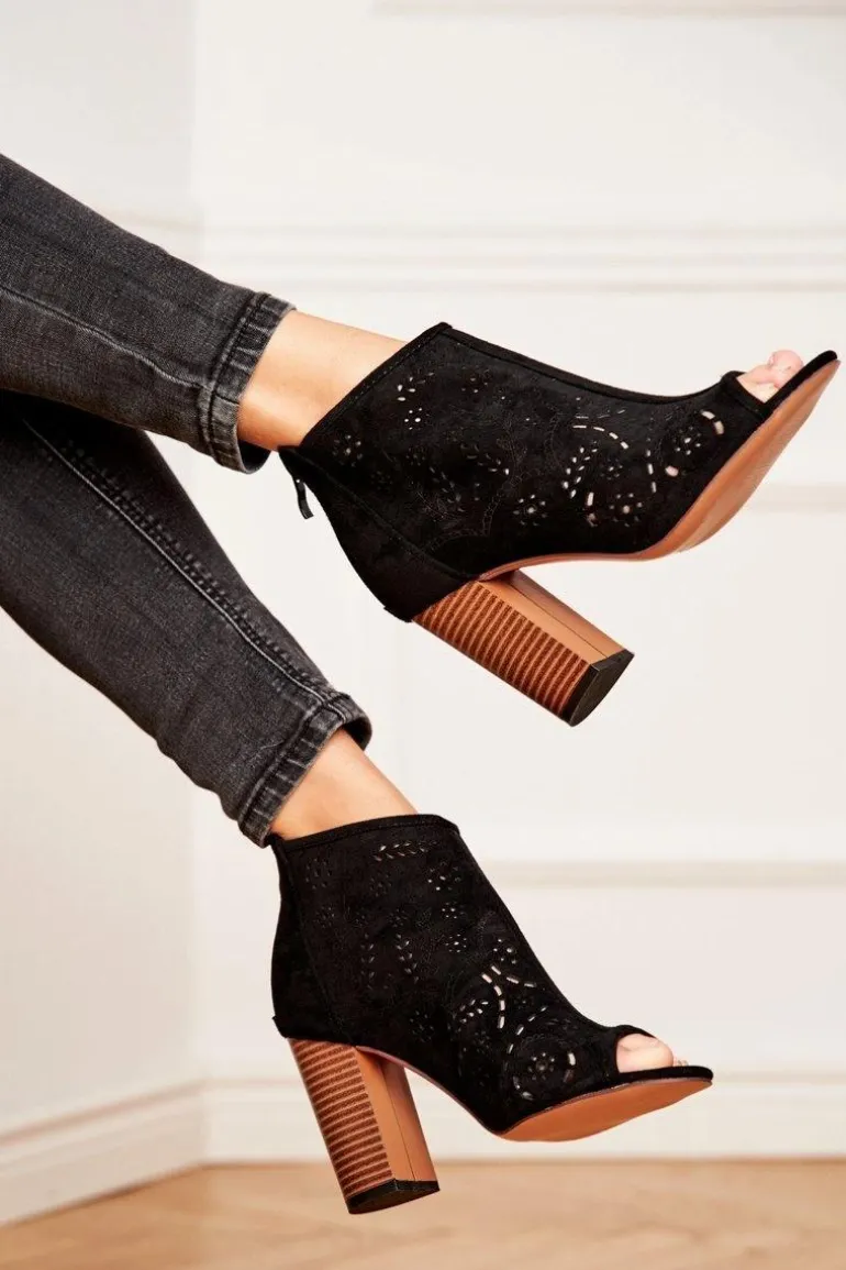 Botki Damskie Na Słupku Zamszowe Ażurowe Czarne Papillon