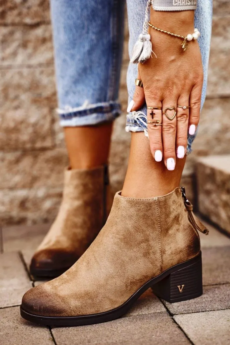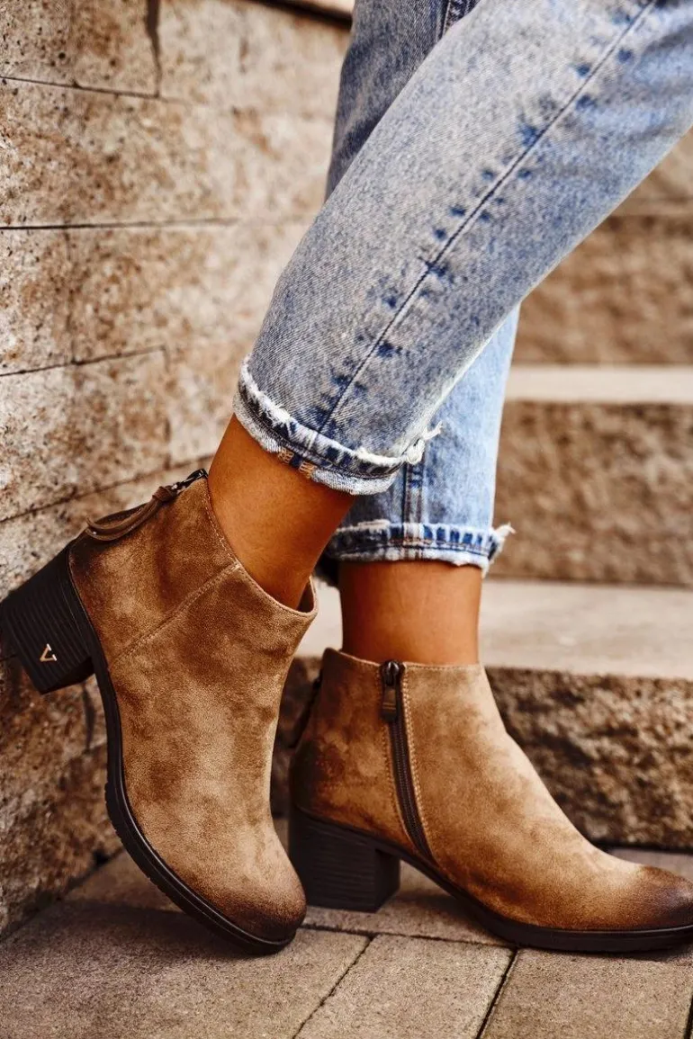 Spraw sobie odrobinę luksusu i wybierz nasze wspaniałe botki na obcasie. Niepowtarzalny styl botków z migdałowym noskiem oraz ozdobnym zamkiem z tyłu cholewki. Ciepłe wnętrze pokryte kocem obuwniczym, zapewni nam komfort na każdym kroku nawet w chłodniejsze dni. Zakładanie ułatwi wszyty na boku suwak. Podczas wyboru rozmiaru prosimy kierować się tabelą rozmiarów.