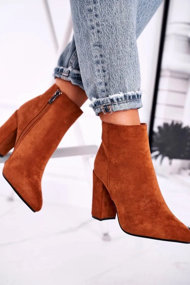 Botki na słupku wykonane z eko-zamszu. Wnętrze ocieplone miłym w dotyku kocem obuwniczym z krótkim włosiem. Zapinane na zamek po wewnętrznej stronie cholewki. Przy wyborze rozmiaru prosimy sugerować się tabelą rozmiarów.