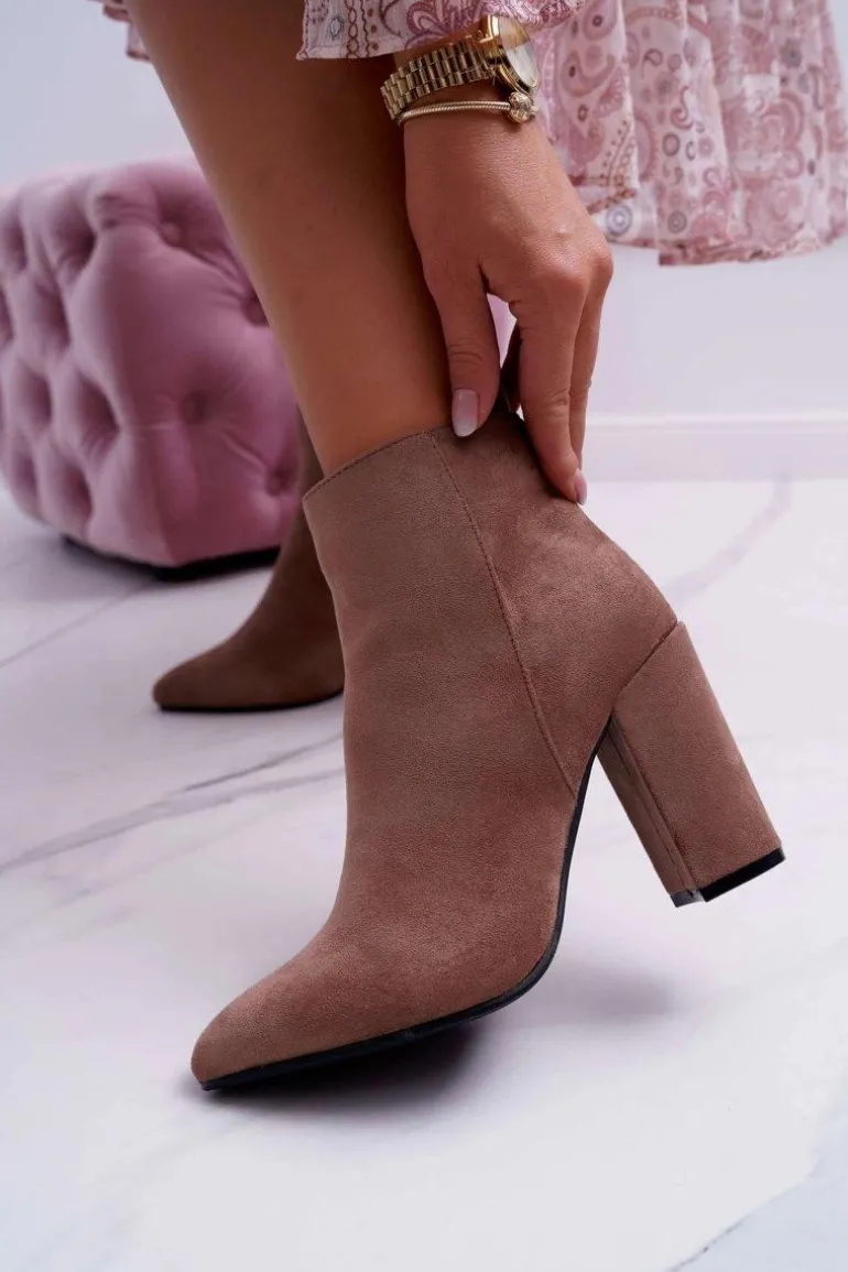 Zamszowe botki na słupku. Wnętrze ocieplone miłym w dotyku kocem obuwniczym z krótkim włosiem. Zapinane na zamek. Przy wyborze rozmiaru prosimy sugerować się tabelą rozmiarów, która dostępna jest po najechaniu bądź kliknięciu w dany rozmiar.