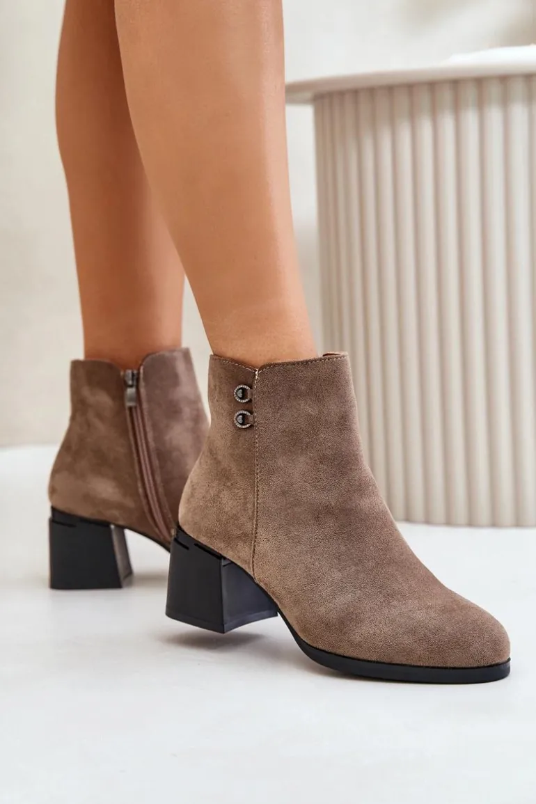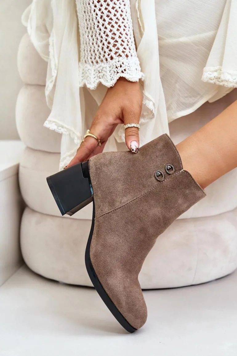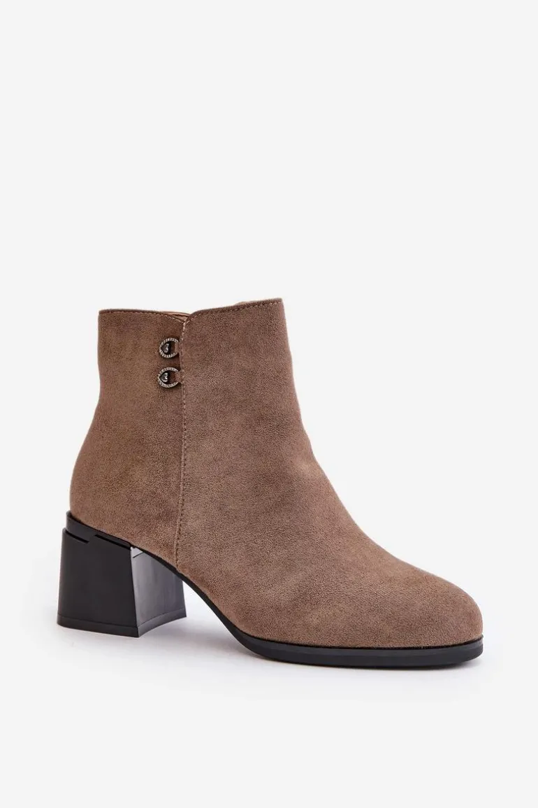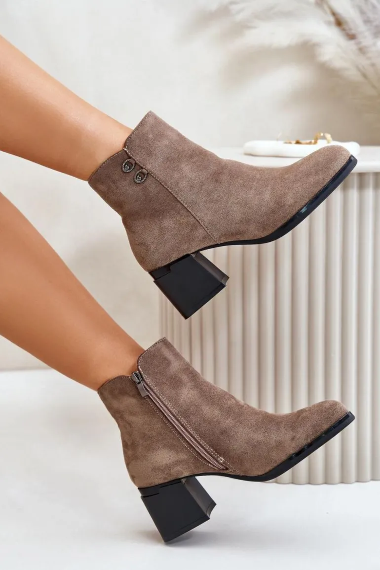 Botki to jedne z najbardziej uniwersalnych i kobiecych butów. Niewątpliwie ten model będzie jednym z Twoich ulubionych! Wykonane z eko skóry. Osadzone na obcasie w formie słupka. Noski zaokrąglone. Zapinane na zamek. Cholewka ozdobiona małymi detalami. Przy wyborze rozmiaru prosimy sugerować się tabelą rozmiarów.