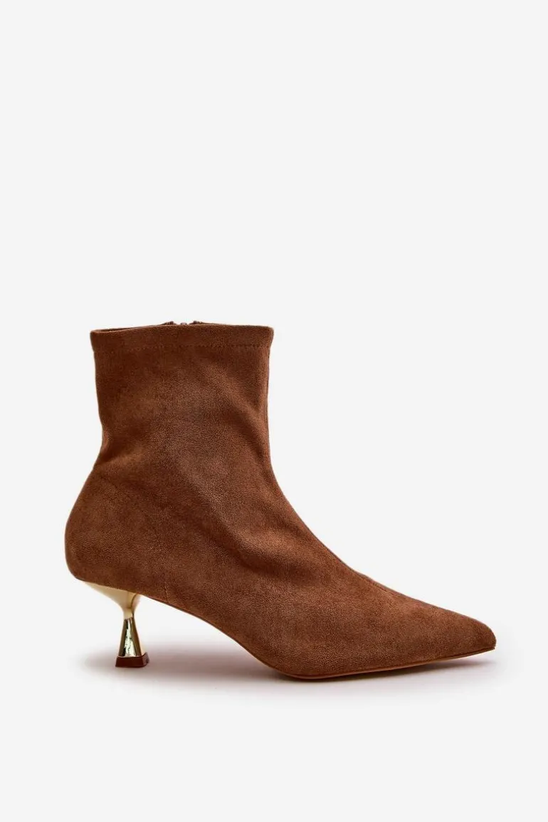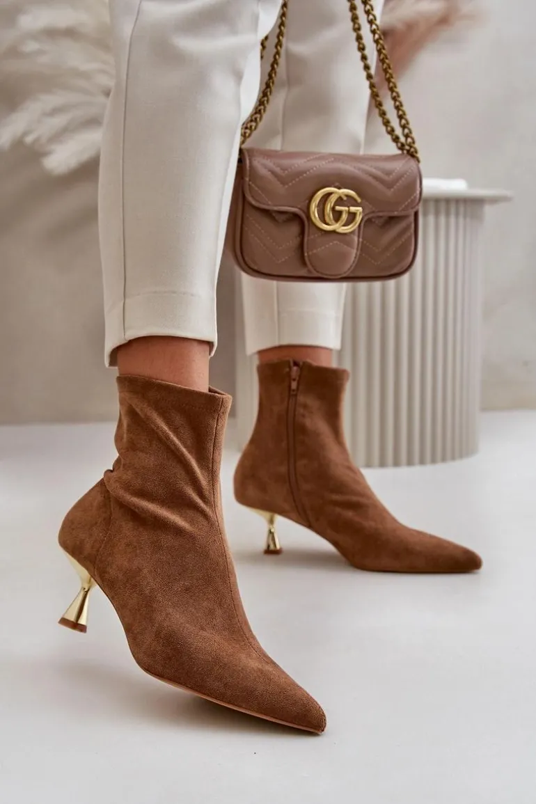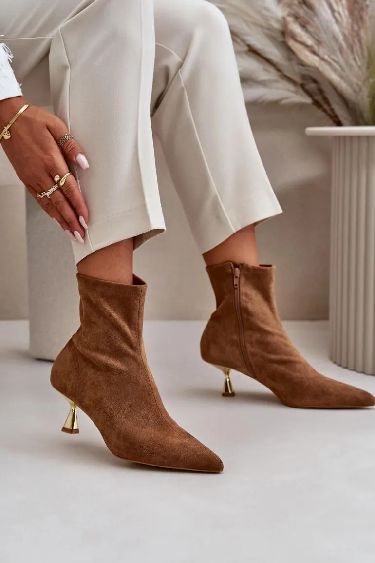 Stylowe botki damskie na ozdobnej szpilce to elegancki dodatek, który z pewnością przyciągnie spojrzenia. Wykonane z eko zamszu. Zapinane na zamek, który zapewnia wygodę i łatwość zakładania. Noski w szpic dodają wyrafinowanego charakteru, podkreślając kobiecość i smukłość sylwetki. Idealne na specjalne okazje, jak i do codziennych stylizacji, kiedy chcesz dodać sobie odrobinę elegancji. Przy wyborze rozmiaru prosimy sugerować się tabelą rozmiarów.