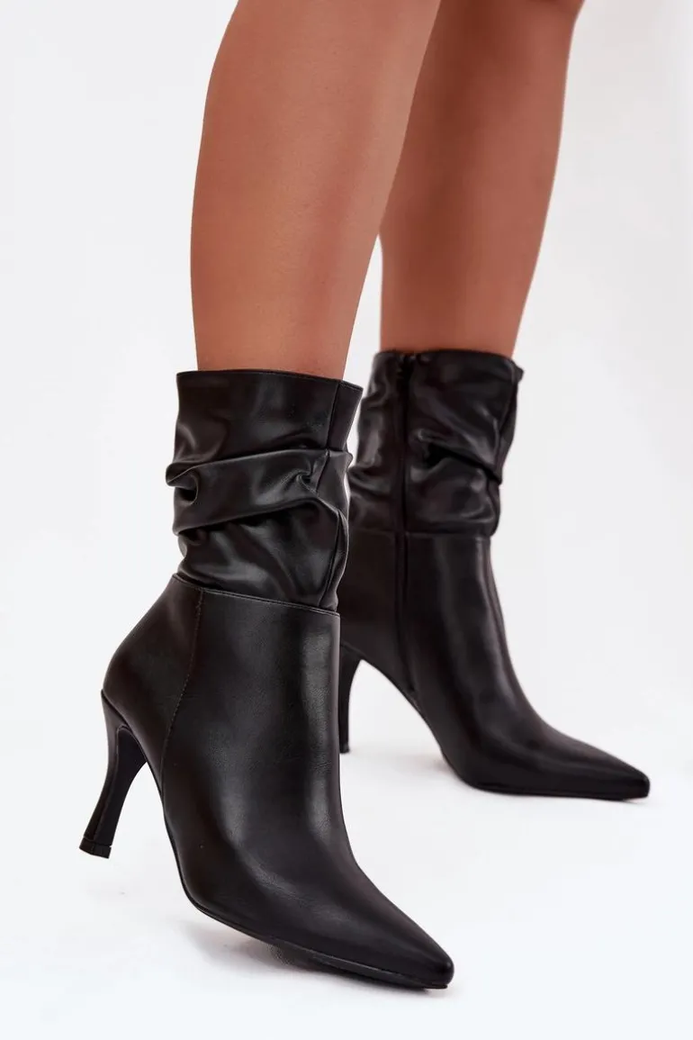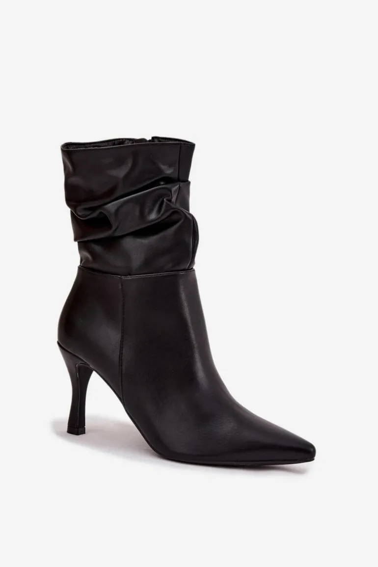 Eleganckie botki damskie z marszczoną cholewką to propozycja pełna kobiecego charakteru. Model ze szpiczastymi noskami i smukłą szpilką podkreśla nogi i dodaje stylu każdej stylizacji. Zamek z boku ułatwia szybkie zakładanie i idealne dopasowanie do stopy, czyniąc botki świetnym wyborem na wieczorne wyjścia i eleganckie okazje. Przy wyborze rozmiaru prosimy sugerować się tabelą rozmiarów.