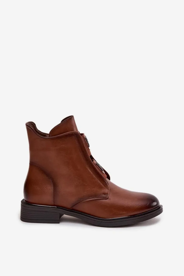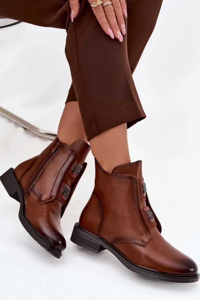 Botki damskie z eko skóry to wygodne i stylowe obuwie na chłodniejsze dni. Osadzone na niskim obcasie, zapewniają komfort podczas codziennego noszenia. Model zapinany na zamek jest praktyczny, a ocieplenie kocem obuwniczym gwarantuje ciepło i wygodę. Z przodu buty zdobią dwa ozdobne detale, które nadają im eleganckiego charakteru. Przy wyborze rozmiaru prosimy sugerować się tabelą rozmiarów.