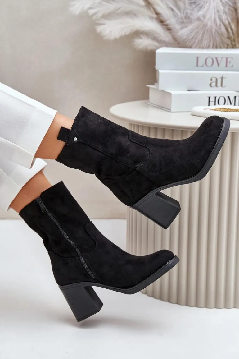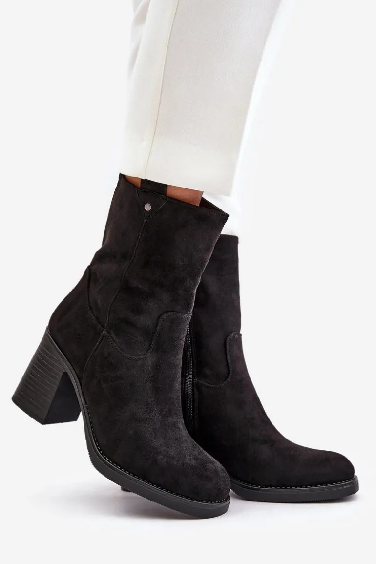 Botki damskie z eko zamszu. Ocieplane kocem obuwniczym. Noski zaokrąglone. Obcas w postaci słupka. Zapinane na zamek. Klasyczny fason, który dopełni wiele jesienno-zimowych stylizacji! Przy wyborze rozmiaru prosimy sugerować się tabelą rozmiarów.