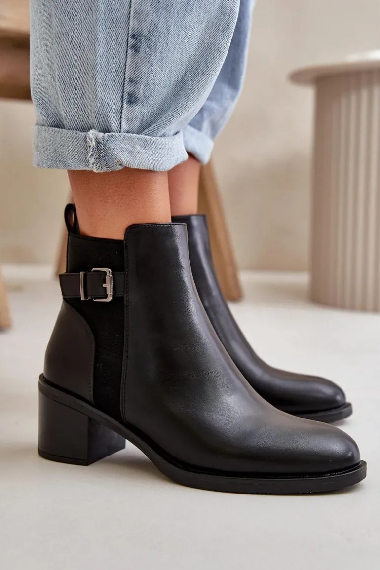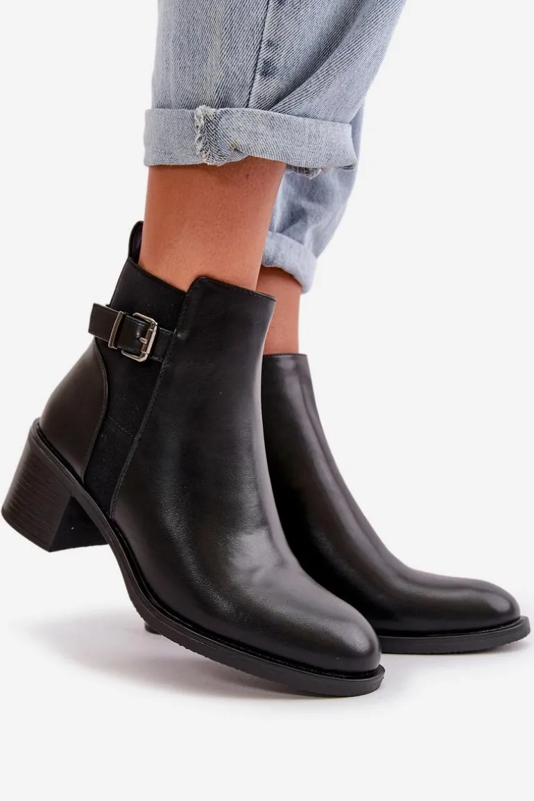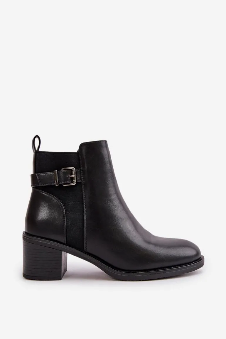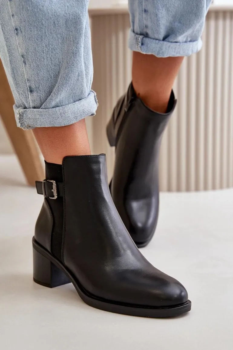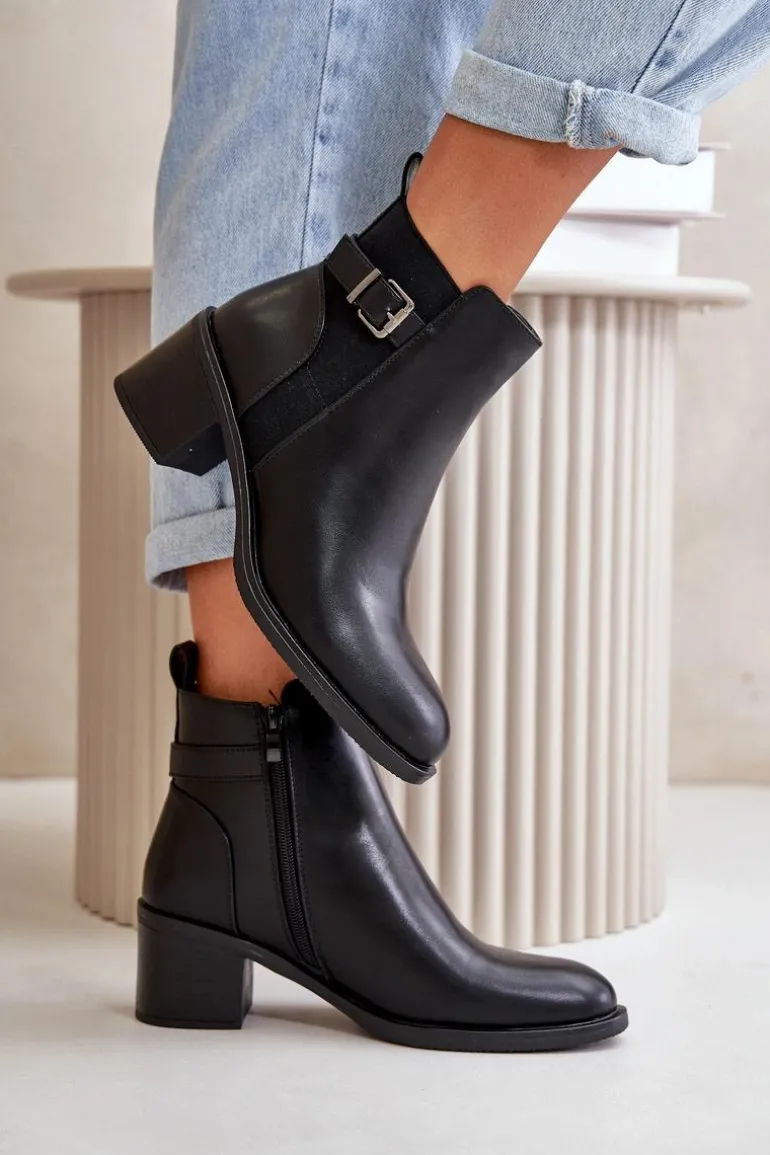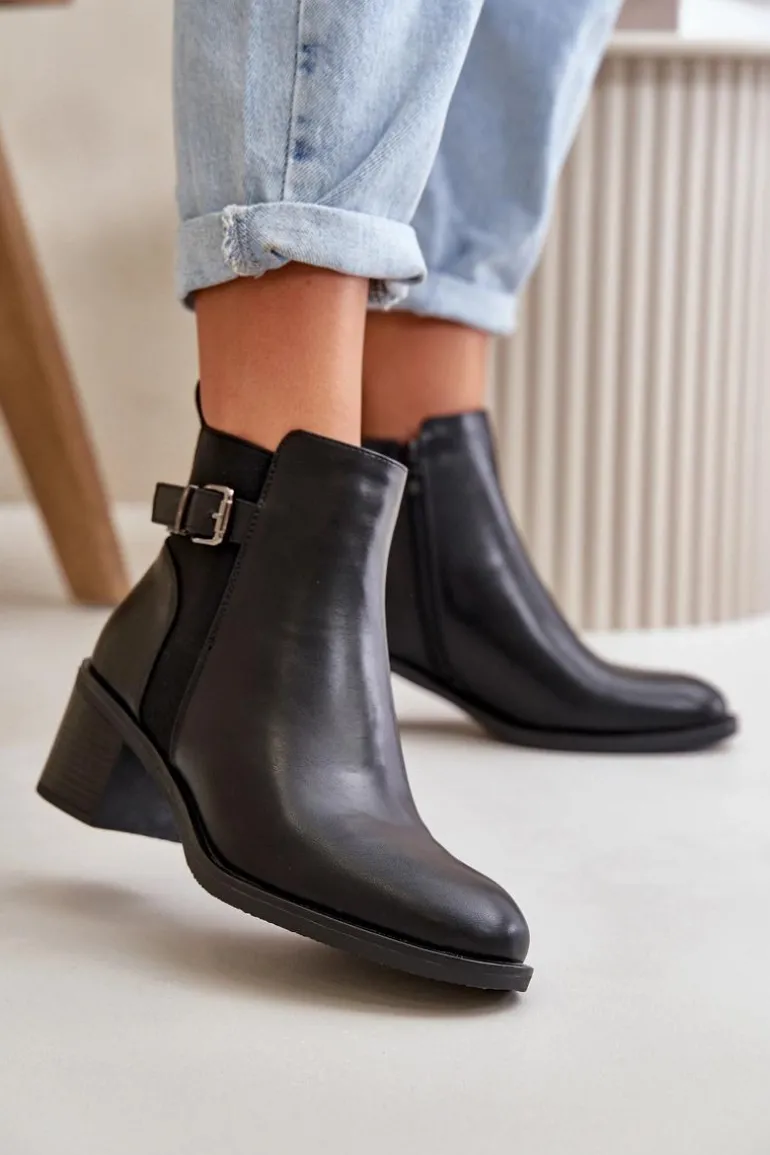 Botki damskie wykonane z eko skóry. Wnętrze ocieplone jest kocem obuwniczym, co zapewnia dodatkowe ciepło i komfort podczas chłodniejszych dni. Model zapinany na zamek, co ułatwia zakładanie i zdejmowanie, a także zapewnia doskonałe dopasowanie do stopy. Ozdobione detalem w postaci paseczka z klamrą. Idealne na jesienne i zimowe dni! Przy wyborze rozmiaru prosimy sugerować się tabelą rozmiarów.