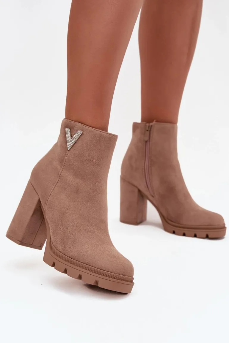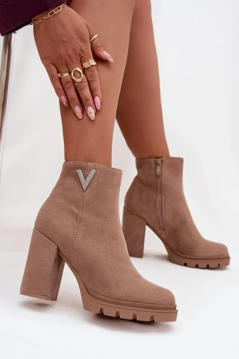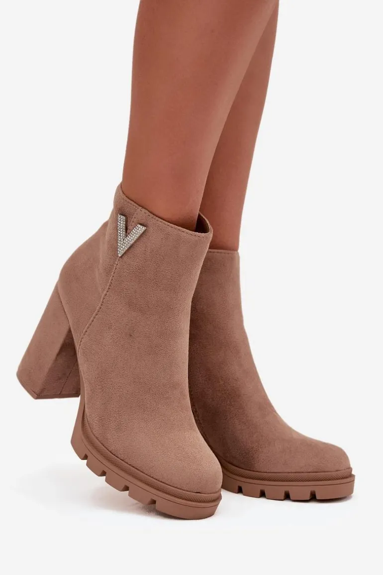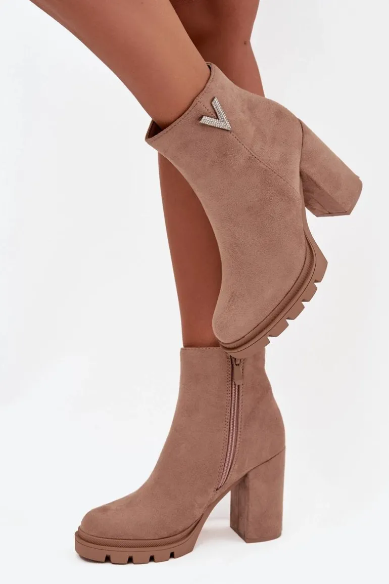 Botki damskie z eko zamszu to elegancka propozycja dla kobiet ceniących styl i wygodę. Osadzone na stabilnym obcasie typu słupek, zapewniają komfort noszenia i subtelnie podkreślają sylwetkę. Zaokrąglone noski nadają im klasycznego charakteru, a praktyczny zamek ułatwia zakładanie i zdejmowanie. Uwagę przyciąga błyszczący detal w kształcie litery V umieszczony z boku cholewki, który dodaje oryginalności i modnego akcentu. To model doskonały zarówno do codziennych, jak i eleganckich stylizacji.