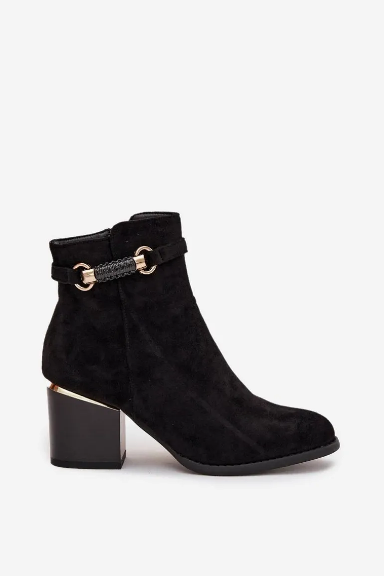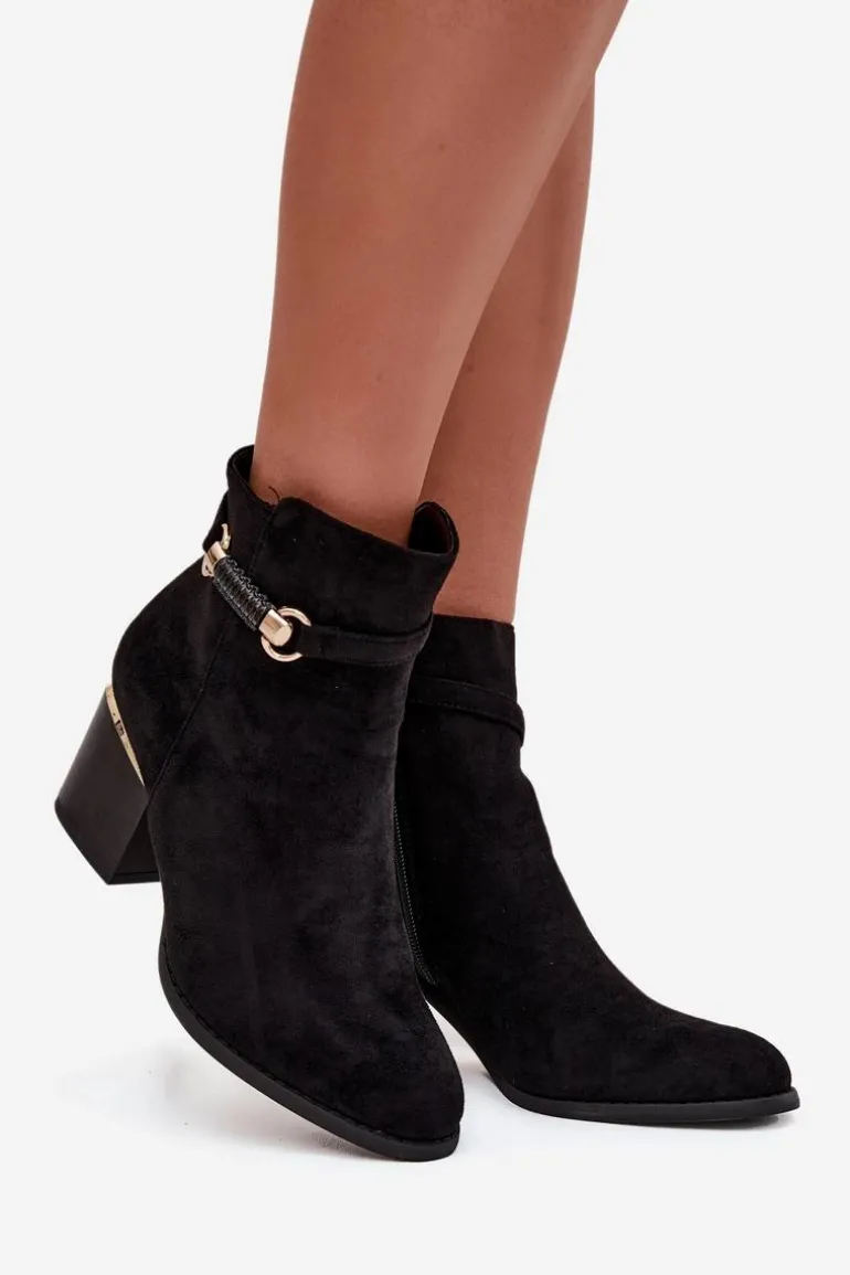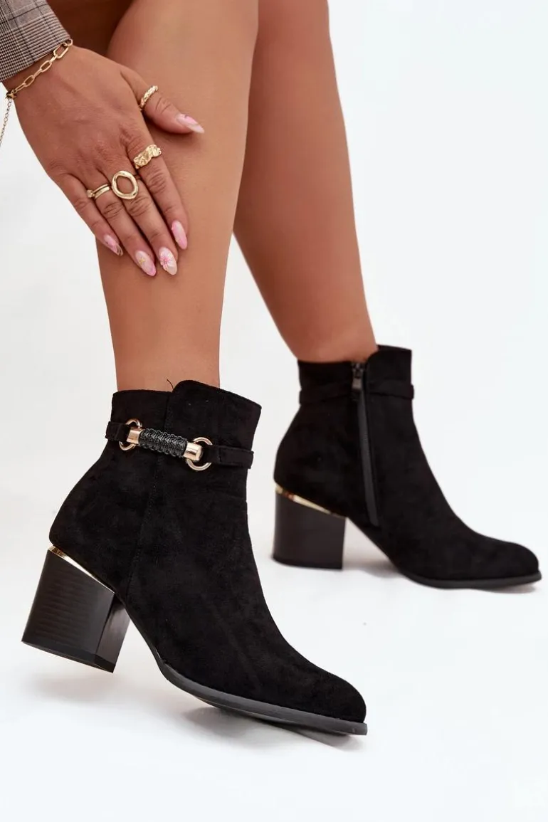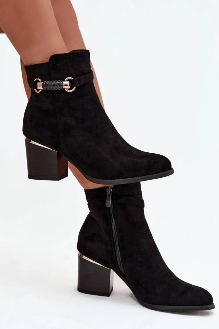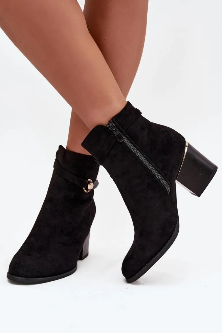 Botki damskie z eko zamszu to doskonała propozycja na chłodniejsze dni. Osadzone na stabilnym obcasie typu słupek ze złotym elementem, prezentują się stylowo. Wnętrze butów zostało ocieplone kocem obuwniczym, co zapewnia komfort termiczny. Zamek ułatwia zakładanie i zdejmowanie, a ozdobny pasek na cholewce nadaje eleganckiego charakteru. To model, który świetnie sprawdzi się zarówno w codziennych, jak i bardziej formalnych zestawach.