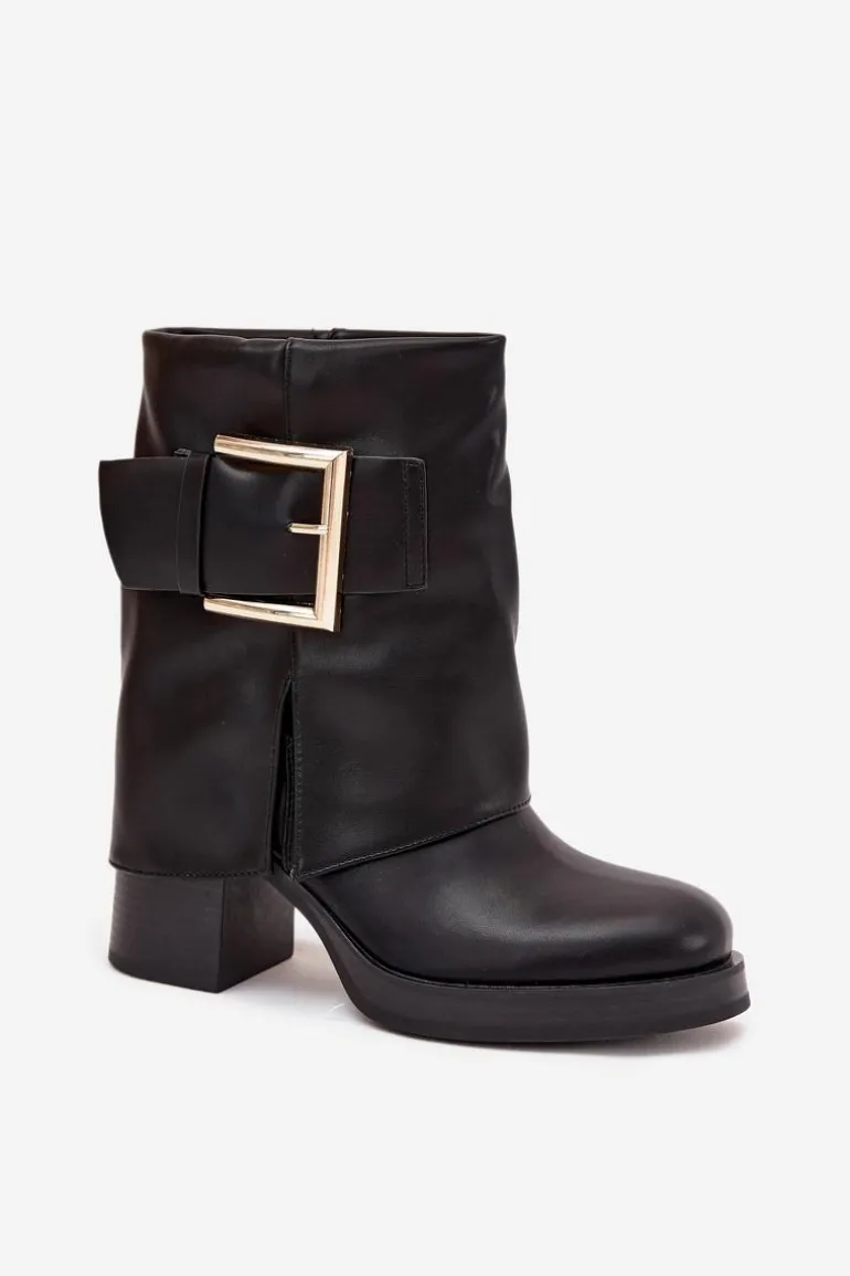 Botki damskie z eko skóry, osadzone na obcasie słupku, to stylowa propozycja na chłodniejsze dni. Model wsuwany, z ociepleniem kocem obuwniczym, zapewnia komfort i ciepło. Wyróżniają się elegancką złotą klamrą, która dodaje im wyjątkowego charakteru, a zaokrąglone noski gwarantują wygodę przez cały dzień. Doskonałe do codziennych stylizacji, idealnie komponują się z sukienkami, spódnicami czy spodniami. Przy wyborze rozmiaru prosimy sugerować się tabelą rozmiarów.